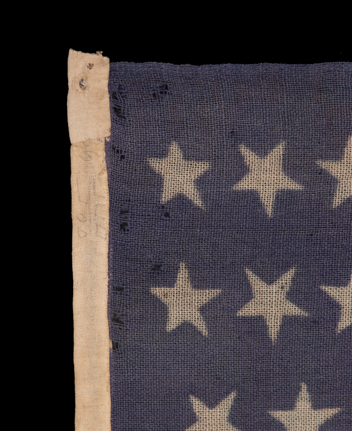 34 STARS WITH "DANCING" OR "TUMBLING" ORIENTATION, ON AN ANTIQUE AMERICAN FLAG, PRESS-DYED ON WOOL BUNTING, WITH A PERIWINKLE BLUE CANTON; LIKELY PRODUCED FOR USE AS MILITARY CAMP COLORS; CIVIL WAR PERIOD, circa 1861-1863, REFLECTS THE ADDITION OF KANSAS TO THE UNION AS A FREE STATE |