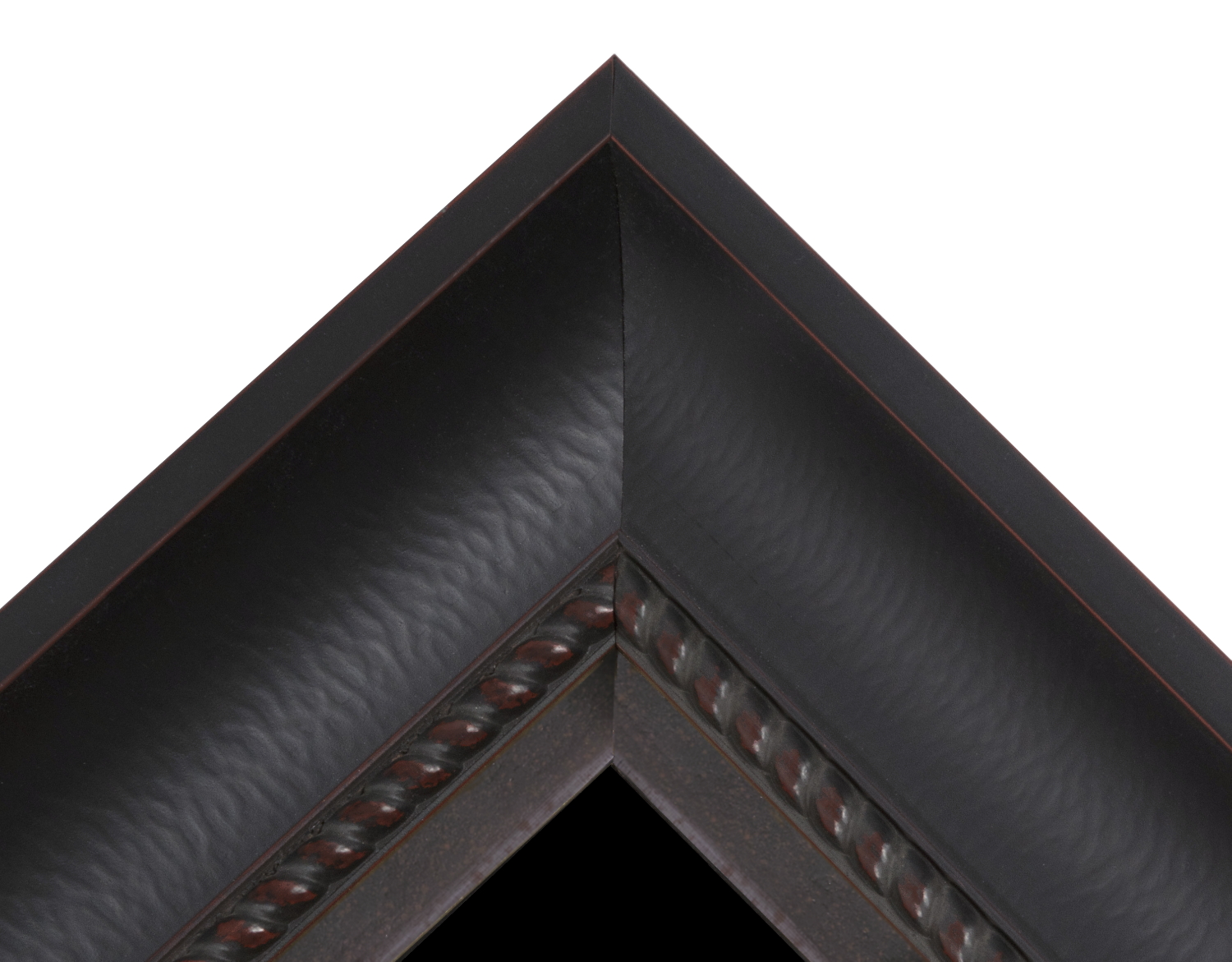 The background is 100% cotton twill, black in color, that has been washed and treated for colorfastness. The mount was placed in a substantial molding is dark brown in color, almost black, with reddish undertones and highlights, with a concave shape, a textured surface, and a rope-style inner lip. To this a flat profile molding, with a finish like old gunmetal, was added as a liner. The glazing is U.V. protective acrylic (Plexiglas).