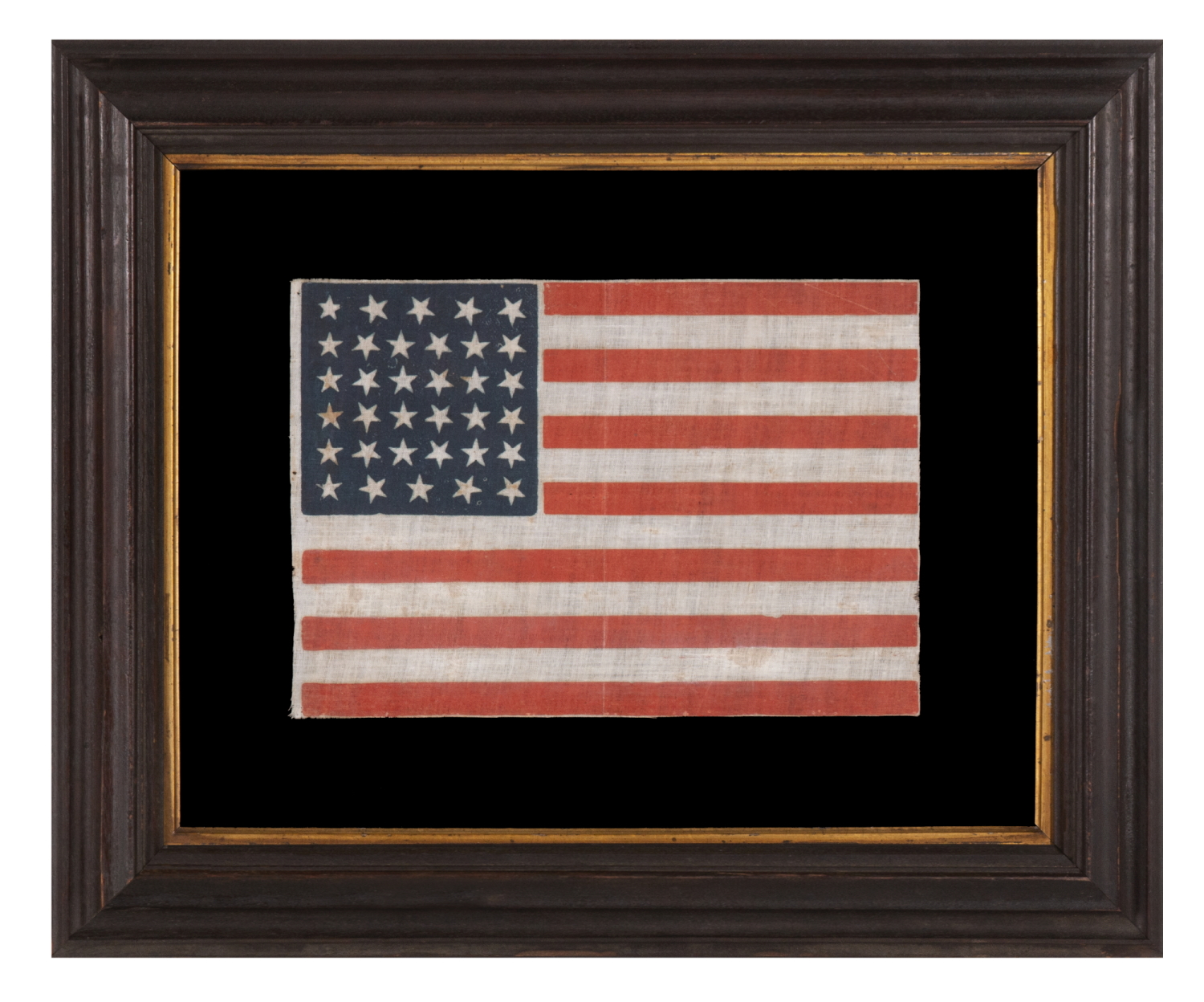 34 star American national flag, printed on glazed cotton. Kansas was admitted into the Union as the 34th state on January 29th, 1861, about 2 ½ months before the Confederate assault on Fort Sumter that marked the beginning of the Civil War. The 34th star was officially added on July 4th of that year, but most flag makers would have added a 34th star with the addition of Kansas in January. The star count remained official until July 4th, 1863, and 34 star flags would have generally been produced until the addition of West Virginia in June of that year.
