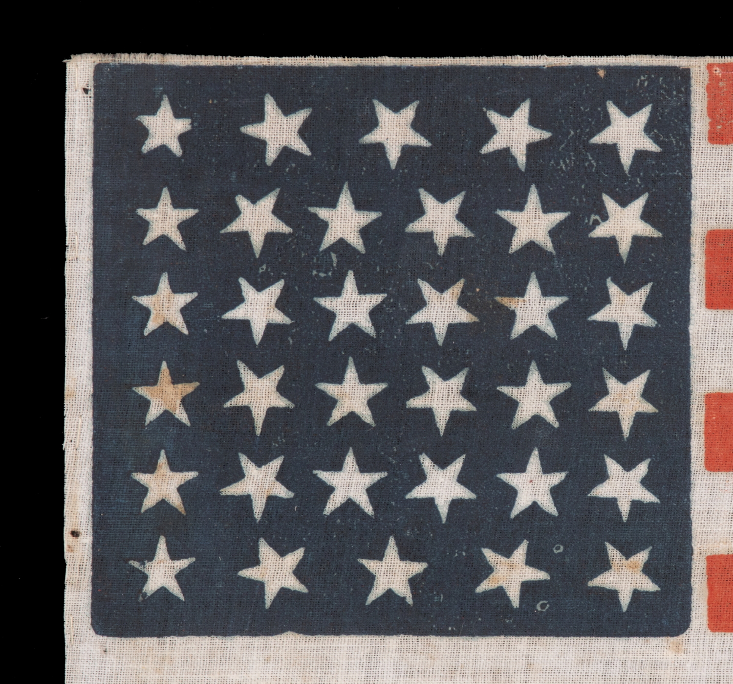 34 STARS, WITH SCATTERED POSITIONING, ON AN ANTIQUE AMERICAN PARADE FLAG MADE DURING THE OPENING TWO YEARS OF THE CIVIL WAR, 1861-63, KANSAS STATEHOOD |