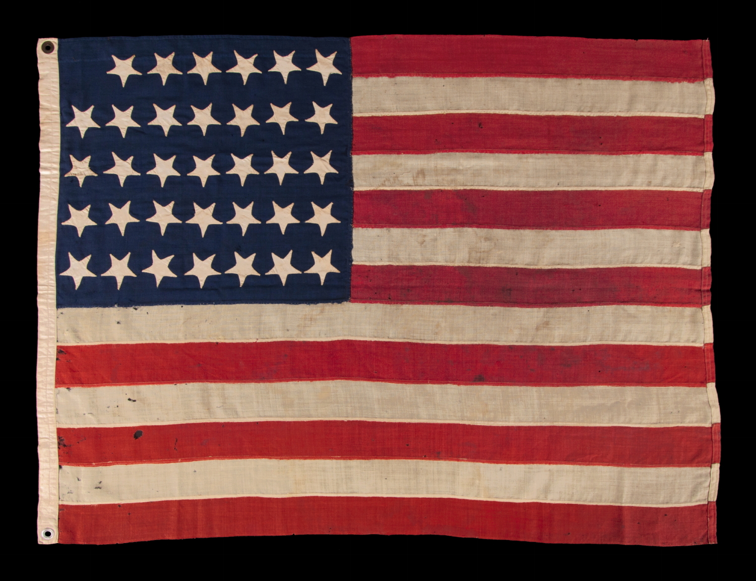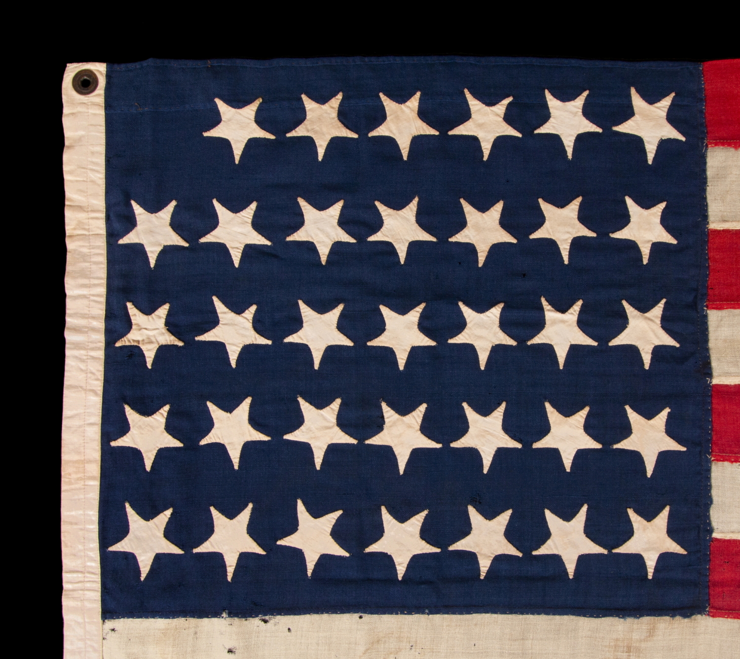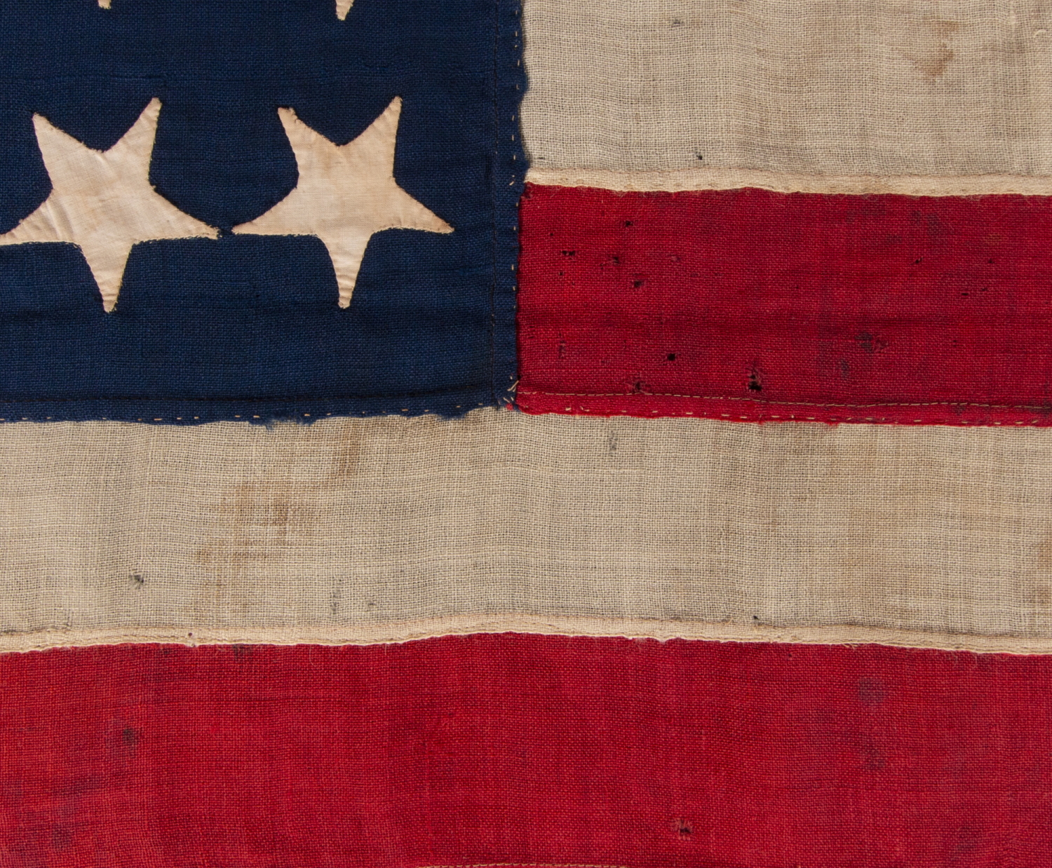 34 UPSIDE-DOWN, HAND-SEWN STARS IN A NOTCHED CONFIGURATION, ON AN ANTIQUE AMERICAN FLAG OF THE CIVIL WAR PERIOD, WITH A SQUARISH PROFILE AND IN AN EXTREMELY SMALL SCALE AMONG ITS COUNTERPARTS; FOUND IN PENNSYLVANIA & RELATED TO ANOTHER FLAG FOUND IN THE RAFTERS OF A BARN IN PERRY COUNTY; REFLECTS THE ADDITION OF KANSAS AS THE 34TH STATE, circa 1861-1863 |