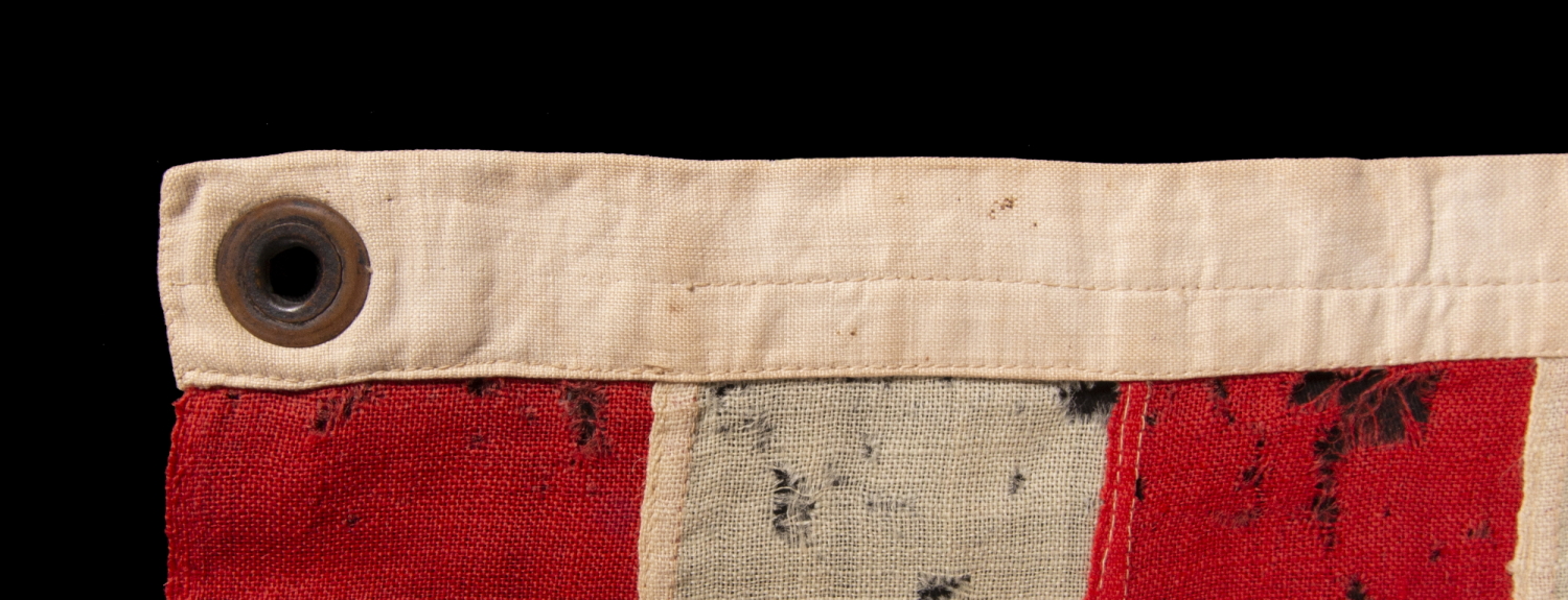 34 star American national flag of the Civil War period, with a number of interesting and desirable features. Chief among these is the scale of the flag among counterparts of the period. At just three by four feet, its size is extremely small among those with pieced-and-sewn construction. During the 19th century, sewn flags (as opposed to those that were printed on cloth) were typically eight - fourteen feet in length on the fly. Both the garrison flags and the largest flags flown on U.S. Navy ships, were 36 feet by Army & Navy regulations. Flags needed to be large in order to serve their function as signals, to be recognized at great distance. A six-footer was considered small, and production of flags smaller than this was extremely limited. Even infantry battle flags, carried on foot, were approximately six by six and-one-half feet, plus fringe, if present. It wasn't until the 1890’s that commercial flag-makers began to produce smaller sewn flags in great quantity. The stars of this particular 34 star example are arranged in rows, the first of which contains one fewer star. This results in what I call a “notched” design, leaving one space open for the addition of another star. The blank space leaves little doubt that the maker of the flag assumed that another Western Territory would soon acquire statehood, or perhaps that West Virginia might be annexed from Virginia, to become its own state. The latter of these two events took place on June 20th, 1863. Note how the stars are oriented so that they are upside-down on their vertical axis, with two points up instead of one. No one knows if this positioning bore any particular meaning. Both modern notions of the correct orientation of a star, and the present official design of the American flag, dictate that the stars are to be oriented with one point up. Because there was no official specification for this aspect of the American flag until 1912 (along with no official proportions, placement of the canton against the striped field, shades of red and blue, star configuration, shape of the stars, etc.), there was simply no official standard. It may be that the maker of the flag did not consider any particular position to be right-side-up or upside-down. In the mid-19th century, it was not uncommon to see stars pointing any which way, varied throughout the arrangement. Whatever the case may be, the feature present on this particular flag is unusual to the eye and notable in terms of its presentation. Made of cotton, the stars are entirely hand-sewn and double-appliquéd (applied to both sides). The canton and stripes of the flag are made of wool bunting. Because blue wool bunting generally came in a width of 18", the canton was pieced from two lengths of fabric, joined by hand-stitching. The top edge of the canton was hemmed by hand. The canton is joined to the striped field and hemmed by a combination of both hand and treadle stitching. The top section of the stripes, from the lower edge of the canton upward, were pieced and hemmed in the same fashion. Those below it were sewn by treadle stitching only, and the fly end was hemmed in the same fashion. There is a sailcloth canvas binding along the hoist, treadle sewn, though hemmed by hand at the top and bottom, with two metal grommets. The top grommet is made of brass. Heavier than normal and intentionally hammered flat, it is a peculiar match with those present on the other example of like kind—the only other occasion on which I have seen something similar. The lower grommet appears to have at some point been replaced with one of white metal. It seems likely that the need for doing so generated from the excessive hammering of the original, which almost certainly weakened the fabric at that juncture, the excessive weight of which probably exacerbated the issue. Curiously, the other flag that I owned in this design was constructed of the same fabrics, except for the binding, the majority of which was of heavy, polished, jacquard weave linen (exceptional from a textile connoisseur’s perspective, and highly unusual). The mix of hand and treadle stitching differed only slightly. Found hanging in the rafters of a barn near the town of Newport, Pennsylvania, north of Harrisburg, in rural, Perry County, I suspect that both it, and the flag that is the subject of this narrative—also found in Pennsylvania—were made in a small, cottage industry setting. Though the other flag bore initials and a surname of a former owner along the binding (the initials “J.D.” or “J.B.,” followed by the name “Hawkins” or “Hawkens”), it was not possible to positively identify the individual. The closest match was a James B. Harkins of Philadelphia, who enlisted as a volunteer at the rank of private, at the age of 22, on August 15th, 1862, and mustered into Company "K" of the 119th Pennsylvania Infantry. He was wounded on December 13th of that year at Fredericksburg, after which his left leg was amputated. He survived the war, having been discharged on March 19th, 1863, but passed on May 19th, 1867. Though his term of service was brief, he was the only volunteer with that surname, and a first name that began with the letter “J,” who listed a middle initial of either “B” or “D.” Whatever the case may be regarding the identity of the owner of the other flag, gut instinct, having owned so many Civil War period examples, is that these flags were both made for military use and war carried for some purpose. The squarish profile of the flag is suggestive of this. Smaller than a battle flag for an artillery or infantry unit, though larger than a Cavalry guidon, they still may have served as such. Perhaps their use was as the national colors for units of dragoons, possibly local militia units, that rode from point-to-point by horse, for the sake of mobility, though dismounted to engage the enemy. Though lacking the forked swallowtail format of a cavalry guidon, the somewhat comparable size is