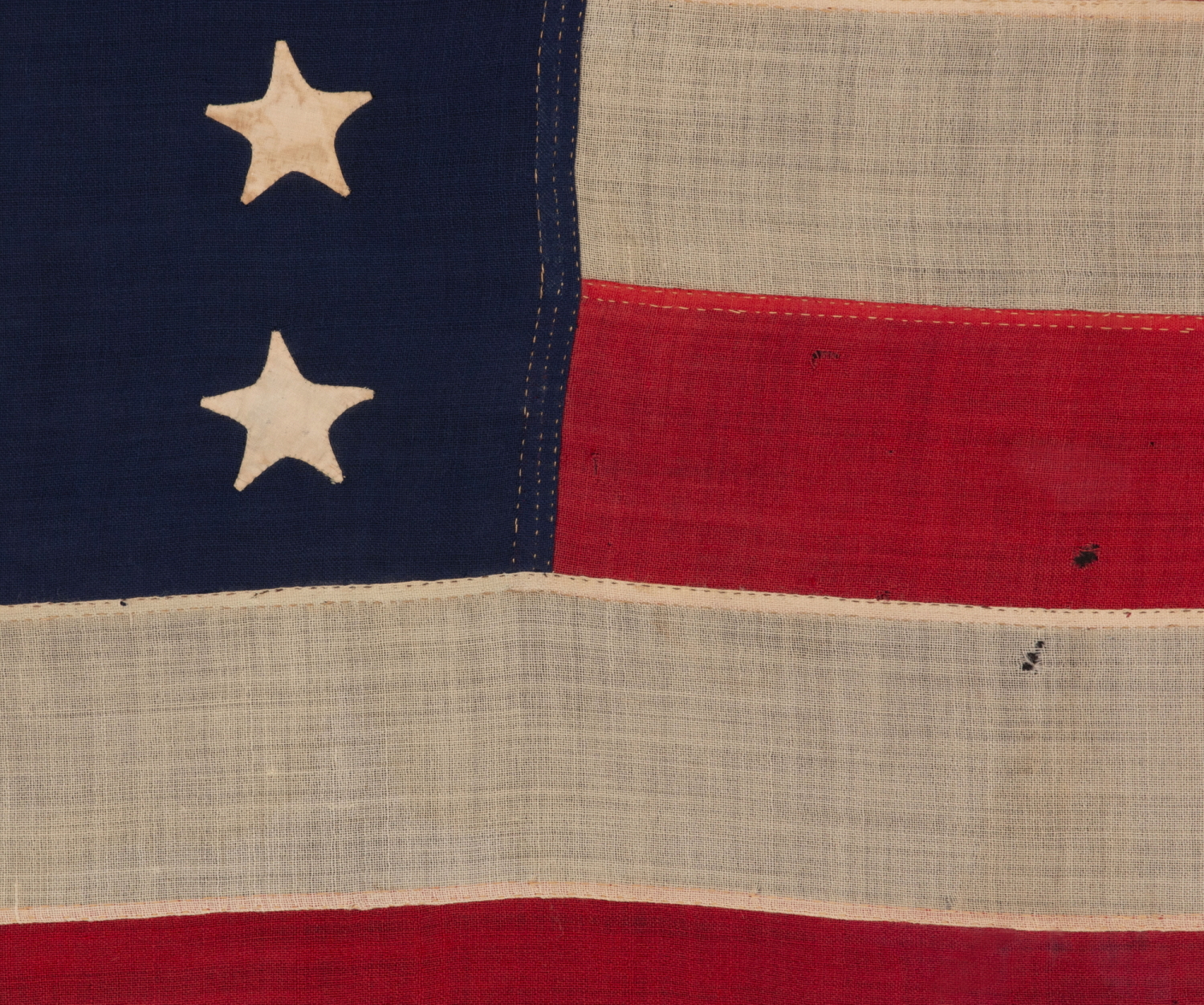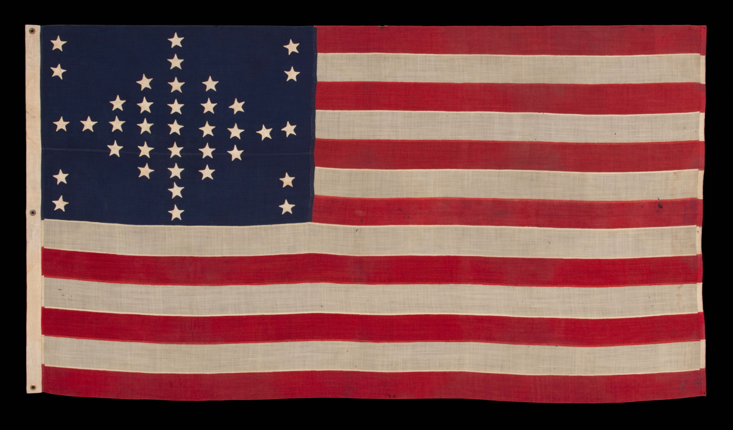37 STARS IN A VERY RARE DIAMOND CONFIGURATION, WITH PILLARS OF STARS ON EITHER SIDE, NEARLY IDENTICAL TO A LARGER EXAMPLE PRESENTED BY CIVIL WAR GENERAL BENJAMIN BUTLER TO PRESIDENT LINCOLN AS THE FIRST AMERICAN FLAG EVER CONSTRUCTED OF ENTIRELY AMERICAN-MADE MATERIALS, JUST 3 DAYS PRIOR TO HIS 1865 ASSASSINATION; THIS STAR COUNT ANTICIPATORY TO THE FUTURE ADDITION OF NEBRASKA |
