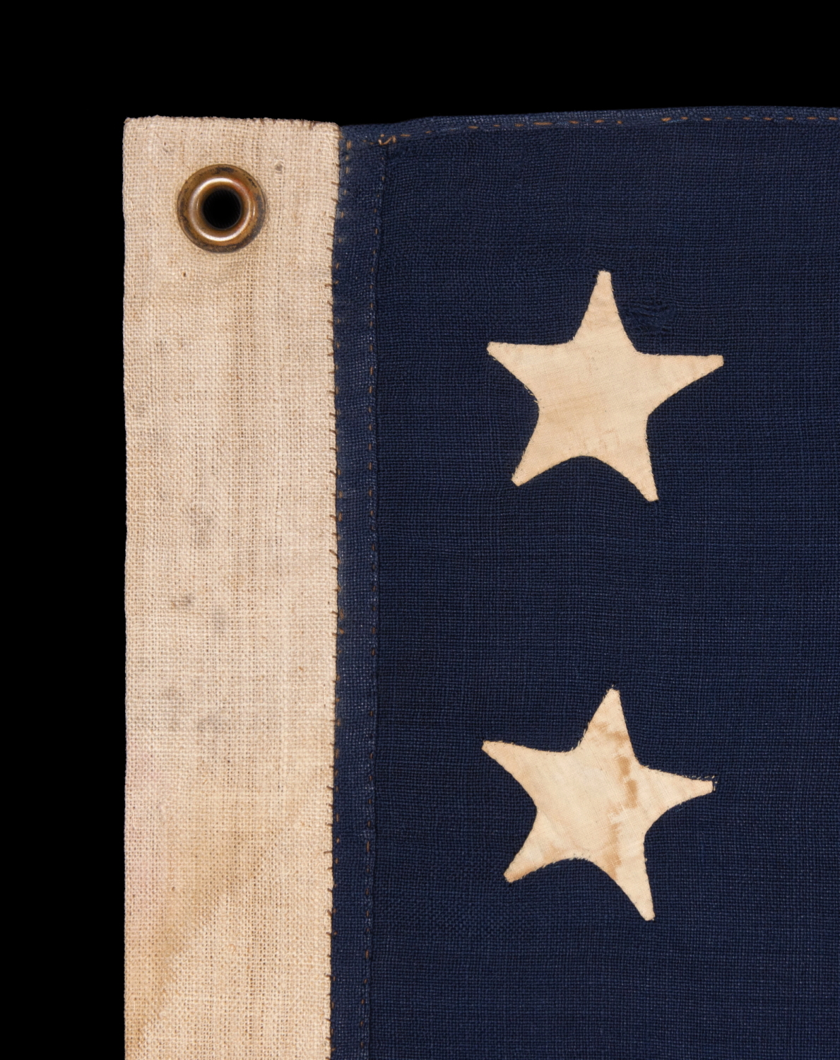 The flag that is the subject of this narrative is a period example of the 37 star, Butler-to-Lincoln presentation flag. Likely produced at the same time, while the Butler-to-Lincoln flag is reported to have measured approximately 8 feet on the hoist x 12 feet on the flag, this counterpart—the only other presently known--is smaller, at approximately 4.5 x 8 feet. In addition to the graphic likeness reflected in the configuration of the stars, the construction of the two flags—while difficult to ascertain due to substandard photography of the Butler-to-Lincoln flag, appears to be identical. The smaller flag is entirely hand-sewn throughout. The stripes and canton of each are made of wool bunting. The stars are made of cotton and are double-appliquéd (applied to both sides). There is a coarsely woven binding along the hoist, made of cotton or linen, possibly a blended fabric, with 3 brass grommets. Although difficult to know with certainty, what I can see of the Butler-to-Lincoln flag suggests that these are very likely the same. The body of the flag (canton and striped field) were folded over onto themselves and hemmed before the binding was applied, with part of the roll-over exposed, in a manner often encountered in U.S. Navy-produced flags of the mid-19th century, as well as some other commercially-produced examples.
