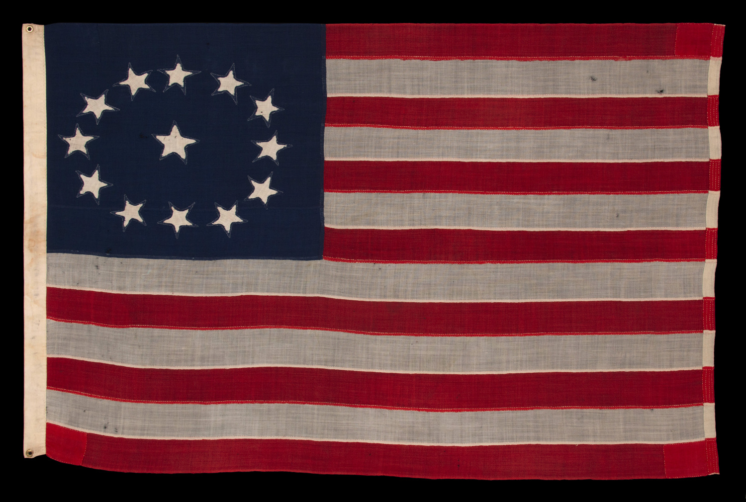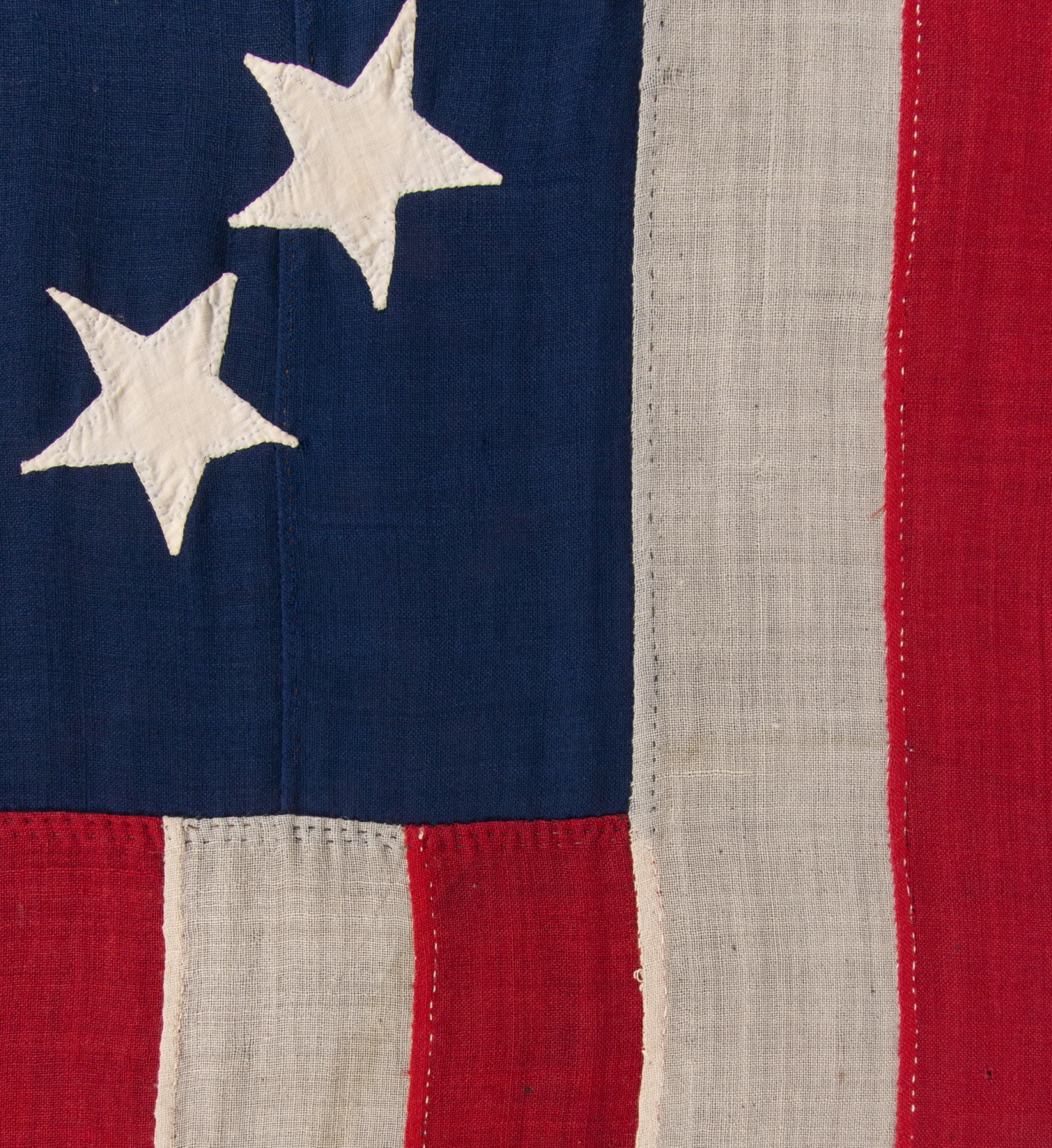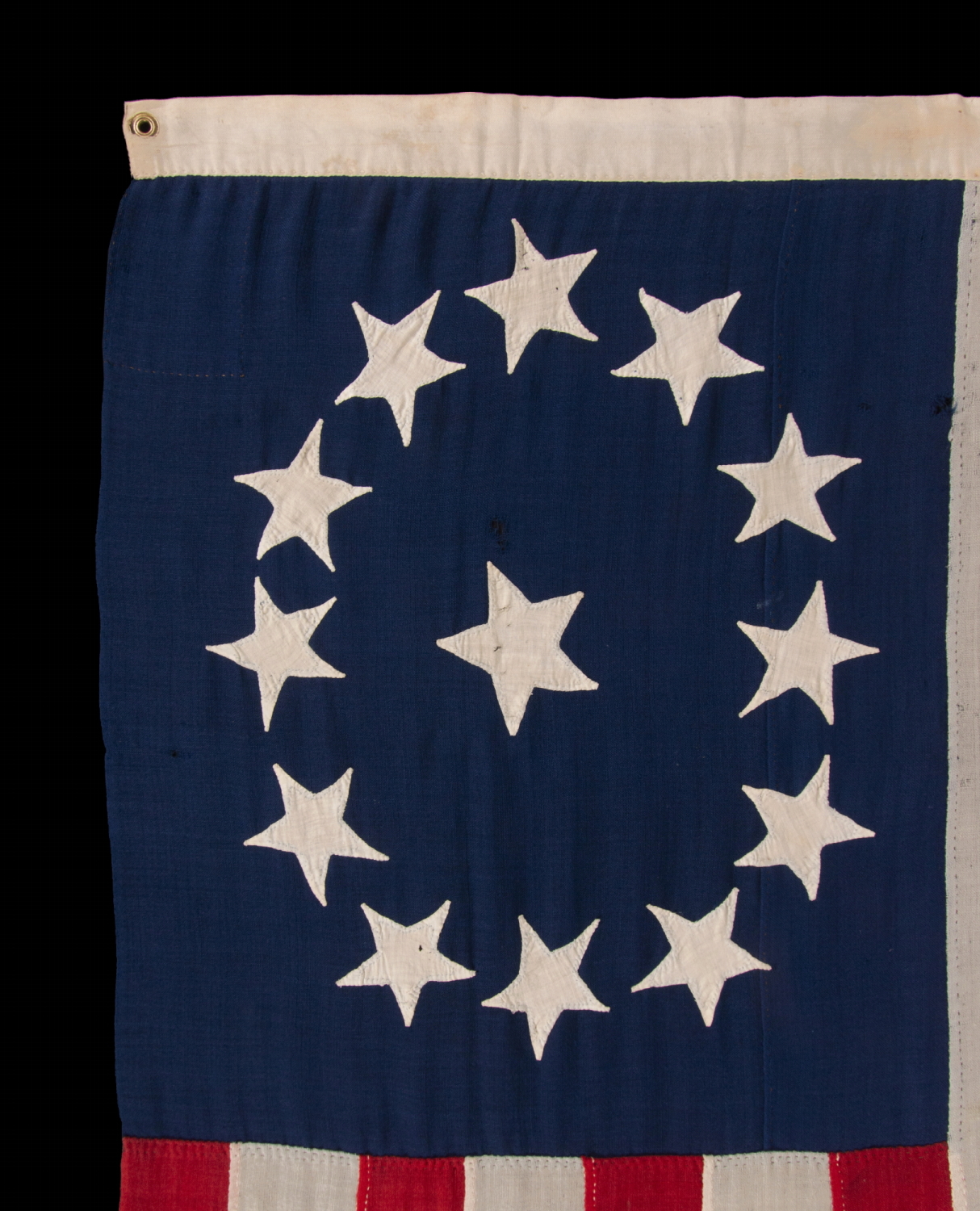 | 13 star American national flag, entirely hand-sewn throughout. Made sometime between approximately the 1850’s and the Civil War (1861-65), the stars are arranged in an oval version of what is known as the 3rd Maryland pattern and are single-appliquéd. This means that they were applied to one side of the blue fabric, which was carefully trimmed from behind, folded over and under-hemmed, so that one star could be viewed on both sides. I have always found single-appliquéd stars more interesting, not only because they are evidence of a more difficult level of seam-work and stitching, but also because they are more visually intriguing. The two visible rows of hand-stitching provide attractive visual qualities, emphasizing the stars’ hand-sewn construction. Note also how the their shape, in conjunction with the sewing, lends a wonderful degree of folk quality to the overall design. Since there was no official star configuration until the 20th century (1912 specifically, beginning with the 48 star count), the stars on 13 star flags may appear in any one of a host of configurations. On this particular example they are arranged in an oval wreath of 12 with a single center star, slightly larger than the rest. This basic configuration, whether oval or circular, has come to be known as the 3rd Maryland pattern. The name comes from a flag that resides at the Maryland State Capitol in Annapolis, long thought to have been present with General Daniel Morgan’s 3rd Maryland Regiment at the Battle of Cowpens in 1781. According to legend, the flag was supposed to have been carried by Color Sergeant William Batchelor of the Maryland Light Infantry and was donated to the state by Batchelor's descendants. The story was disproved in the 1970's, following an examination by the late flag expert Grace Rogers Cooper of the Smithsonian, who discovered that the Cowpens flag was, at the earliest, of Mexican War vintage (1846-48). Despite the lack of direct association with the reputed regiment, many flag collectors and enthusiasts embraced the name, which stuck to the design. The term actually received some legitimacy through the existence of a similar flag, in the collection of the Smithsonian’s National Museum of History & Technology, with verified Maryland provenance. This was carried by the Maryland and District of Columbia Battalion of Volunteers during the Mexican War. This configuration is known to be a very early one, as evidenced by 18th century illustrations, and is actually a contender to have been the design present on the very first flag, of which there is, unfortunately, no descriptive record. Among surviving flags, the 3rd Maryland pattern is most often encountered in those that date to the mid-19th century, roughly within the Mexican War to Civil War time frame (1846-1865). For some reason, it seems to have been less popular during our nation's 100-year anniversary, in 1876, though some examples of that period are known. Both the canton of the flag and the stripes are made of wool bunting. This was a fabric peculiar to the making of flags and banners, not employed in the manufacture of other textiles. The rectangular patches in each corner are called gussets. These are original to the flag's construction and were added for reinforcement at the points where it was subject to the most wear. There is a twill cotton binding along the hoist. This was originally constructed in the form of an open sleeve, through which a rope would be threaded for hoisting. The brass grommets, one each at the top and bottom, appear, due to both their size and their placement, to have been inserted later—an unusual occurrence. Likely this occurred during the 19th century. The first patent for grommets was obtained by E.H. Penfield in 1848. Because Penfield’s specifications were actually recorded as an improvement to existing grommet designs, his were apparently not the first. Another patent was taken by J. Allender in 1854, and three more were recorded before 1870. While grommets obviously existed prior to the Civil War, they are practically never encountered in flag-making prior to 1861, after which time they become extremely common, present in many Civil War flags. A maker’s name was once stenciled in black pigment along the flag’s binding. This has so significantly faded as to have become illegible, in spite of extensive study and examination, by various methods. The characters consist of what is likely a name, applied in an arched format, followed by what is probably a location, configured in a linear format. Maker’s marks are extremely unusual in this period. Though three major firms began to do so, at least in some instances, between roughly 1864 - 1870’s, the presence of many unsigned flags, that I can identify to these firms, based upon various common traits, demonstrates that the use of maker’s marks was extremely inconsistent, a circumstance that persisted well into the 20th century. At just under 6 feet in length on the fly, although this may seem large in a modern context, sewn flags of the 19th century, (as opposed to printed parade flags,) were generally 8-9 feet long and larger. At this time in American history, it was important for flags to serve their intended function as signals, to be recognized at great distance. Even those flags made for decorative use tended to be far larger than their modern counterparts. Because smaller flags are easier to conserve and frame for indoor display, the size of this particular example is desirable for both collectors and one-time buyers alike, small enough to be manageable, but large enough to make prominent visual impact. 13 star flags have been flown throughout our nation’s history for a variety of purposes. They were hoisted at patriotic events, including Lafayette’s visit in 1824-25, the celebration of the centennial of American independence in 1876, and annual celebrations if Independence Day. They were displayed during the Civil War, to re