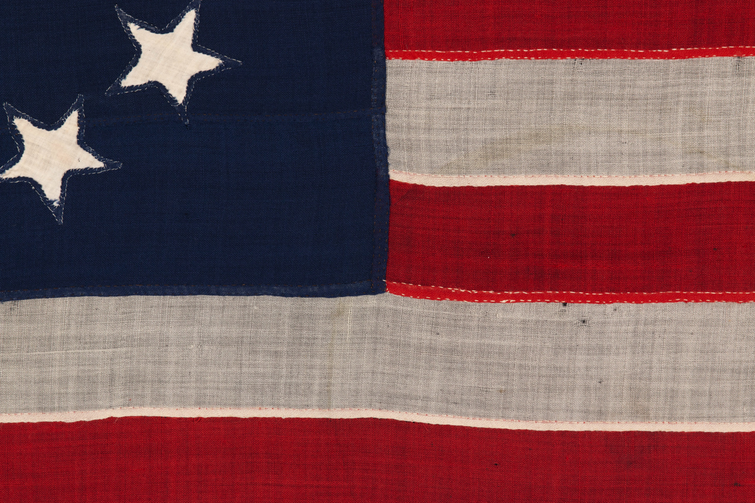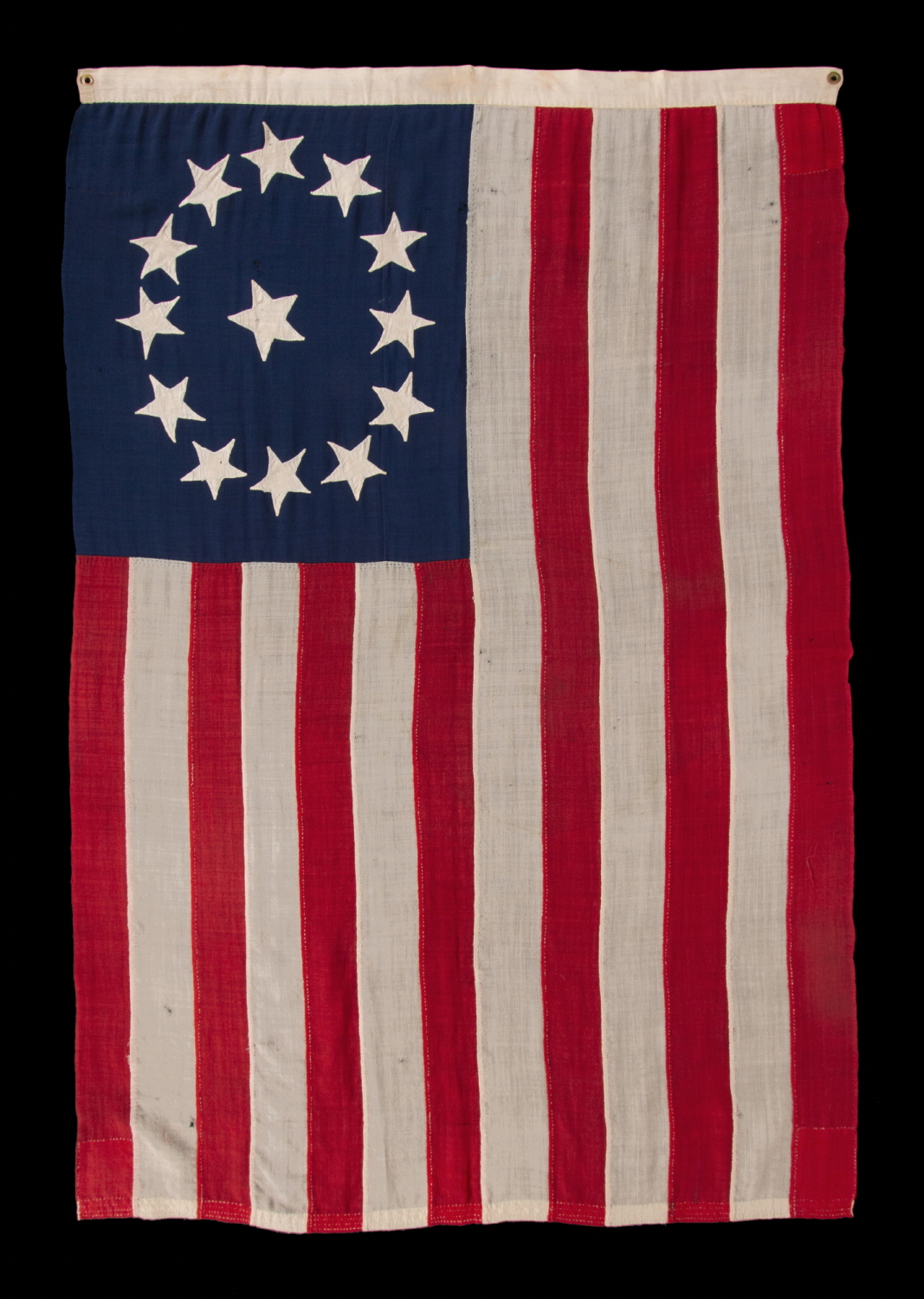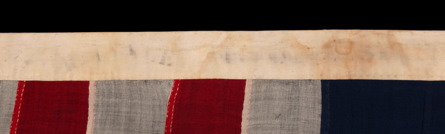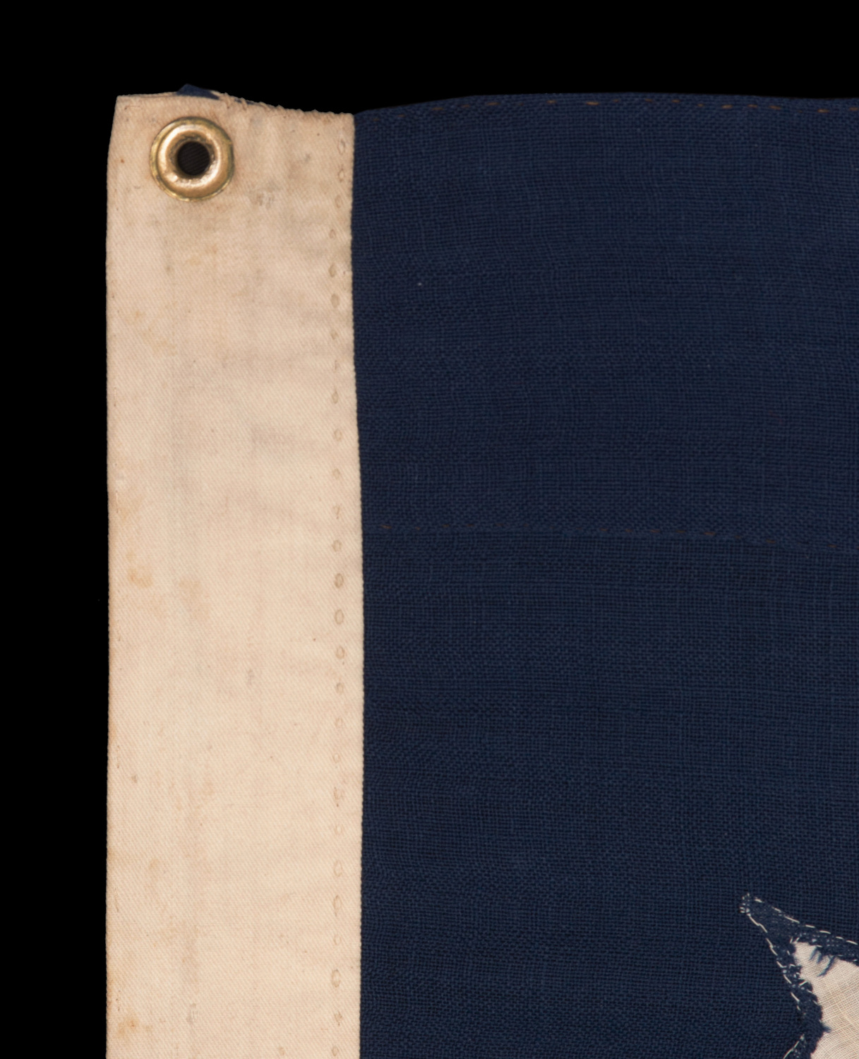 | 13 star American national flag, entirely hand-sewn throughout. Made sometime between approximately the 1850’s and the Civil War (1861-65), the stars are arranged in an oval version of what is known as the 3rd Maryland pattern and are single-appliquéd. This means that they were applied to one side of the blue fabric, which was carefully trimmed from behind, folded over and under-hemmed, so that one star could be viewed on both sides. I have always found single-appliquéd stars more interesting, not only because they are evidence of a more difficult level of seam-work and stitching, but also because they are more visually intriguing. The two visible rows of hand-stitching provide attractive visual qualities, emphasizing the stars’ hand-sewn construction. Note also how the their shape, in conjunction with the sewing, lends a wonderful degree of folk quality to the overall design. Since there was no official star configuration until the 20th century (1912 specifically, beginning with the 48 star count), the stars on 13 star flags may appear in any one of a host of configurations. On this particular example they are arranged in an oval wreath of 12 with a single center star, slightly larger than the rest. This basic configuration, whether oval or circular, has come to be known as the 3rd Maryland pattern. The name comes from a flag that resides at the Maryland State Capitol in Annapolis, long thought to have been present with General Daniel Morgan’s 3rd Maryland Regiment at the Battle of Cowpens in 1781. According to legend, the flag was supposed to have been carried by Color Sergeant William Batchelor of the Maryland Light Infantry and was donated to the state by Batchelor's descendants. The story was disproved in the 1970's, following an examination by the late flag expert Grace Rogers Cooper of the Smithsonian, who discovered that the Cowpens flag was, at the earliest, of Mexican War vintage (1846-48). Despite the lack of direct association with the reputed regiment, many flag collectors and enthusiasts embraced the name, which stuck to the design. The term actually received some legitimacy through the existence of a similar flag, in the collection of the Smithsonian’s National Museum of History & Technology, with verified Maryland provenance. This was carried by the Maryland and District of Columbia Battalion of Volunteers during the Mexican War. This configuration is known to be a very early one, as evidenced by 18th century illustrations, and is actually a contender to have been the design present on the very first flag, of which there is, unfortunately, no descriptive record. Among surviving flags, the 3rd Maryland pattern is most often encountered in those that date to the mid-19th century, roughly within the Mexican War to Civil War time frame (1846-1865). For some reason, it seems to have been less popular during our nation's 100-year anniversary, in 1876, though some examples of that period are known. Both the canton of the flag and the stripes are made of wool bunting. This was a fabric peculiar to the making of flags and banners, not employed in the manufacture of other textiles. The rectangular patches in each corner are called gussets. These are original to the flag's construction and were added for reinforcement at the points where it was subject to the most wear. There is a twill cotton binding along the hoist. This was originally constructed in the form of an open sleeve, through which a rope would be threaded for hoisting. The brass grommets, one each at the top and bottom, appear, due to both their size and their placement, to have been inserted later—an unusual occurrence. Likely this occurred during the 19th century. The first patent for grommets was obtained by E.H. Penfield in 1848. Because Penfield’s specifications were actually recorded as an improvement to existing grommet designs, his were apparently not the first. Another patent was taken by J. Allender in 1854, and three more were recorded before 1870. While grommets obviously existed prior to the Civil War, they are practically never encountered in flag-making prior to 1861, after which time they become extremely common, present in many Civil War flags. A maker’s name was once stenciled in black pigment along the flag’s binding. This has so significantly faded as to have become illegible, in spite of extensive study and examination, by various methods. The characters consist of what is likely a name, applied in an arched format, followed by what is probably a location, configured in a linear format. Maker’s marks are extremely unusual in this period. Though three major firms began to do so, at least in some instances, between roughly 1864 - 1870’s, the presence of many unsigned flags, that I can identify to these firms, based upon various common traits, demonstrates that the use of maker’s marks was extremely inconsistent, a circumstance that persisted well into the 20th century. At just under 6 feet in length on the fly, although this may seem large in a modern context, sewn flags of the 19th century, (as opposed to printed parade flags,) were generally 8-9 feet long and larger. At this time in American history, it was important for flags to serve their intended function as signals, to be recognized at great distance. Even those flags made for decorative use tended to be far larger than their modern counterparts. Because smaller flags are easier to conserve and frame for indoor display, the size of this particular example is desirable for both collectors and one-time buyers alike, small enough to be manageable, but large enough to make prominent visual impact. 13 star flags have been flown throughout our nation’s history for a variety of purposes. They were hoisted at patriotic events, including Lafayette’s visit in 1824-25, the celebration of the centennial of American independence in 1876, and annual celebrations if Independence Day. They were displayed during the Civil War, to re
