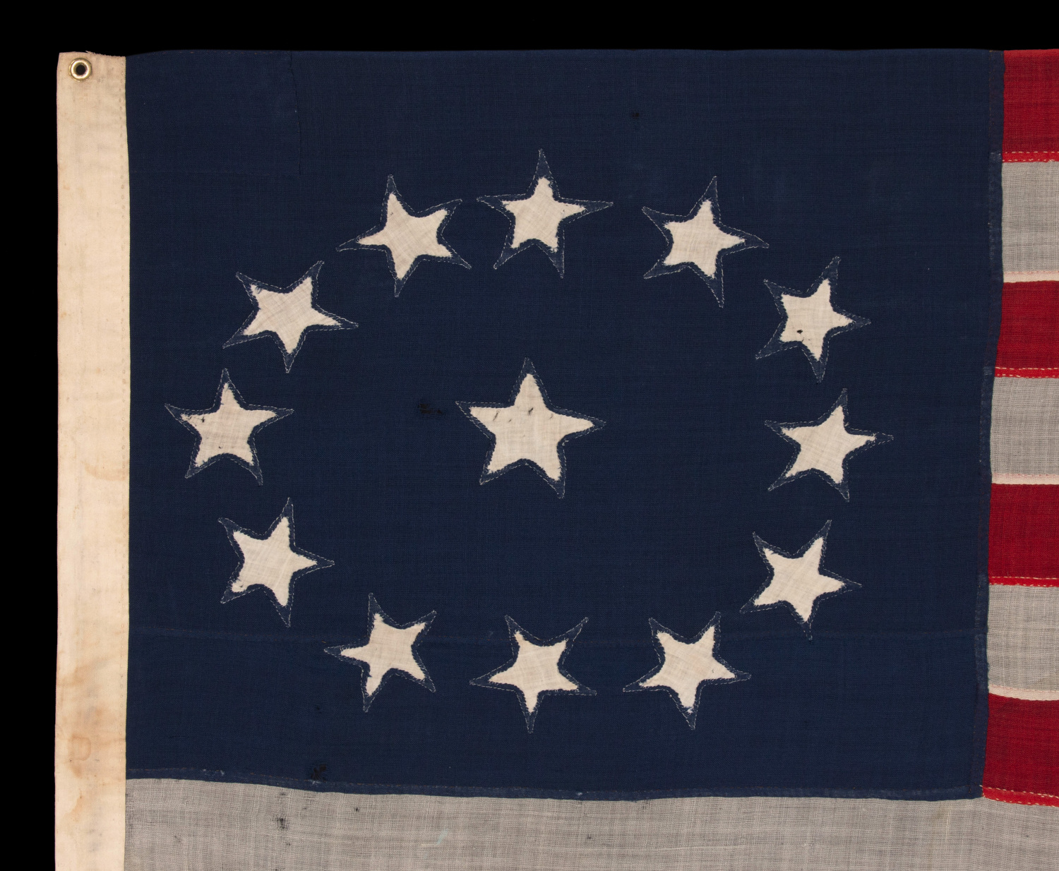 | ENTIRELY HAND-SEWN ANTIQUE AMERICAN FLAG OF THE CIVIL WAR PERIOD, WITH 13 SINGLE-APPLIQUED STARS IN A BEAUTIFUL, OVAL ARRANGEMENT OF WHAT IS KNOWN AS THE 3RD MARYLAND PATTERN, MADE SOMETIME BETWEEN THE 1850’s AND THE CIVIL WAR (1861-65) |