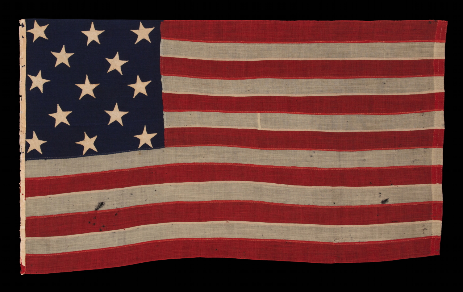 ENTIRELY HAND-SEWN, 13 STAR AMERICAN FLAG, WITH A 3-2-3-2-3 ARRANGEMENT OF STARS, U.S. NAVY SMALL BOAT ENSIGN, LIKELY MADE DURING THE CLOSING YEARS OF THE CIVIL WAR, 1864-1865 |