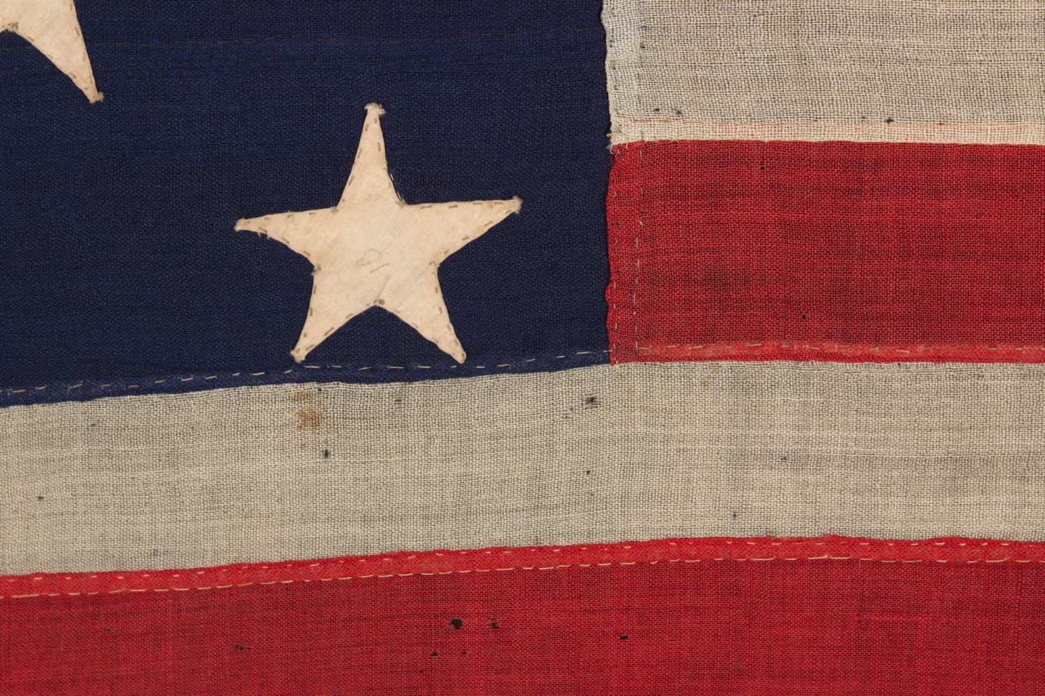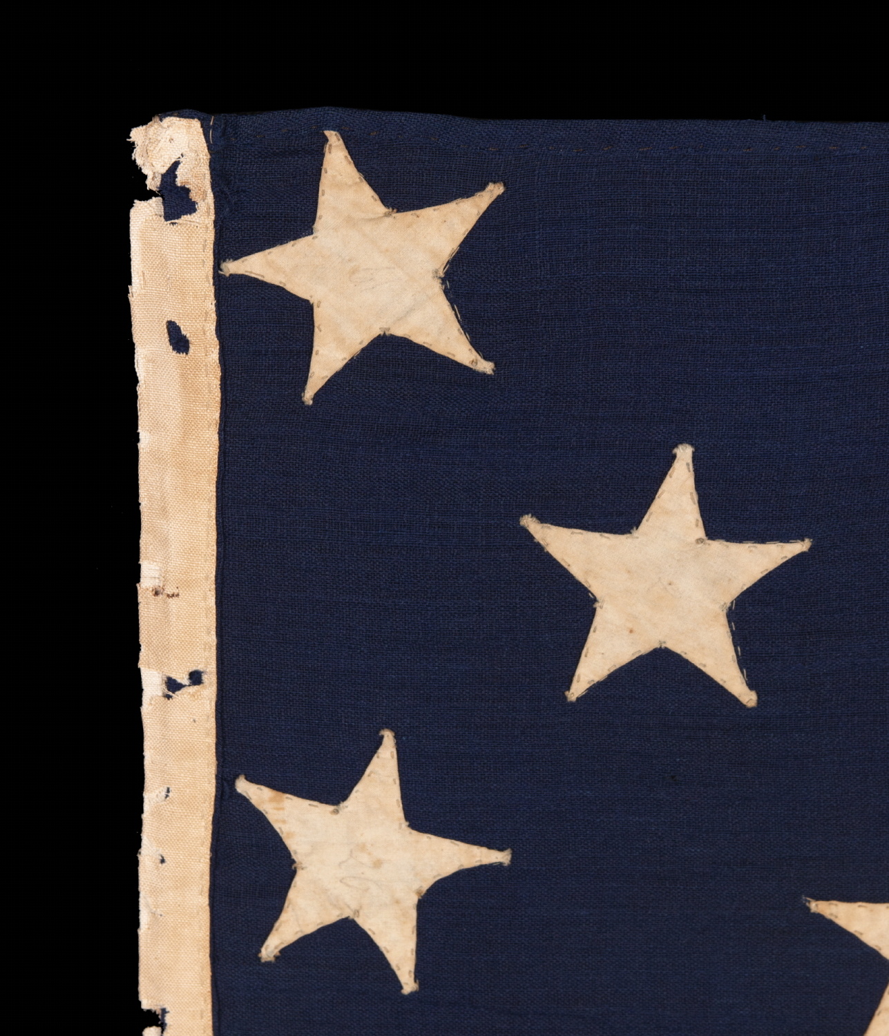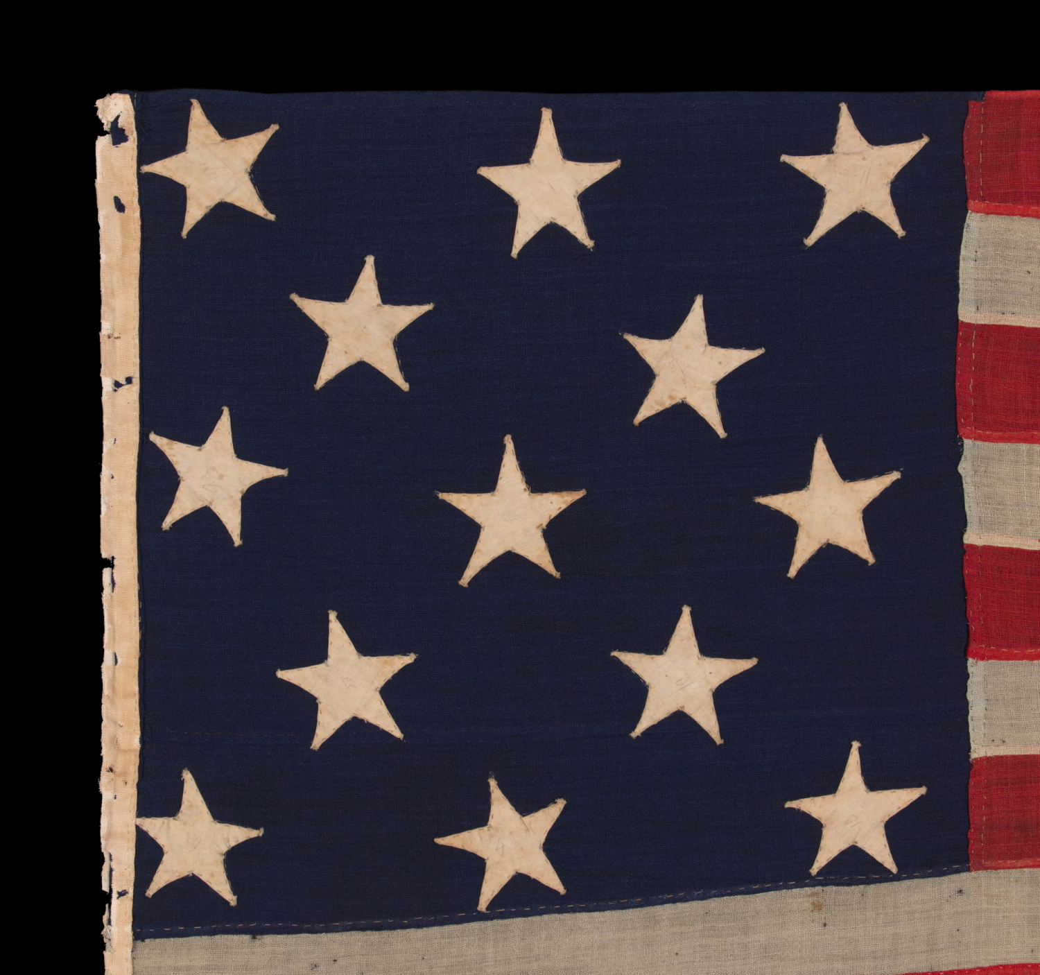 The flag is entirely hand-sewn throughout. The stars are made of plain weave cotton and are double-appliquéd (applied to both sides). The stripes and canton are made of wool bunting. Note how the 3rd white stripe is pieced from two lengths of fabric, as a means of conserving available resources. This is typical in the 19th century. There is a narrow linen or hemp binding along the hoist, in the form of an open sleeve, that has experienced significant degradation, with associated fabric loss.