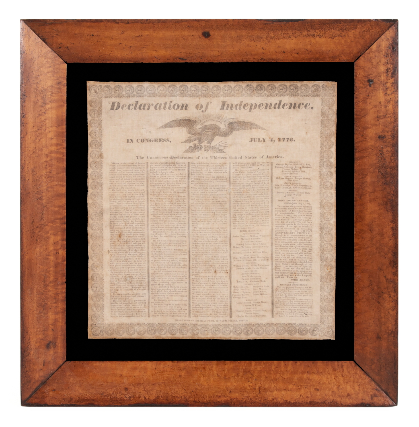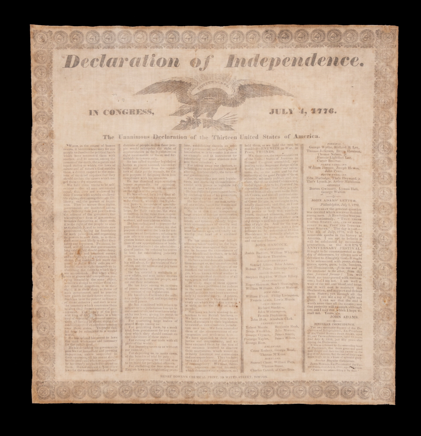 COPY OF THE DECLARATION OF INDEPENDENCE ON CLOTH, PRINTED IN BOSTON IN 1832 TO MEMORIALIZE THE PASSING OF THE LAST SURVIVING SIGNER, CHARLES CARROLL OF MARYLAND, IN THE YEAR THAT COINCIDED WITH THE 100th BIRTHDAY OF GEORGE WASHINGTON |