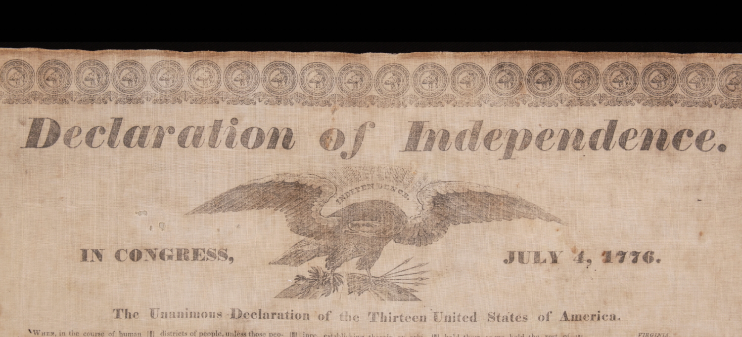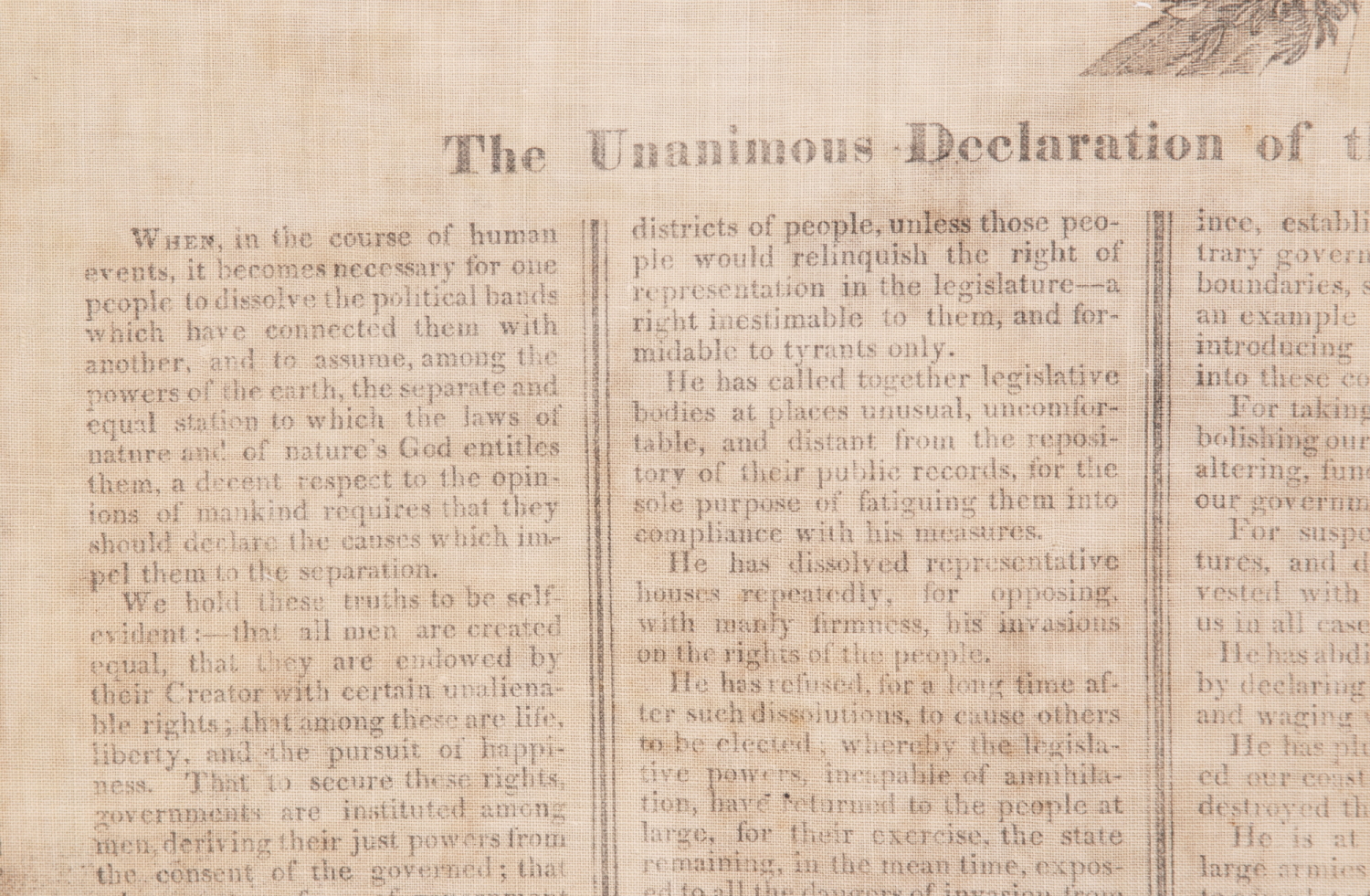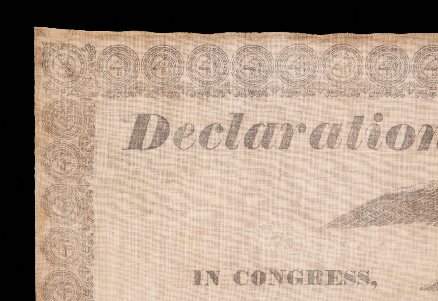 It is of interest to note that prior to 1818, just 14 years before this textile was produced, Americans were not even able to view copies of the Declaration of Independence. The text had been published in some newspapers during the 18th century, but at the time it was more of a tool to achieve independence and not precisely the iconic treasure that it would become. Prior to that time there were no large-scale, printed copies that reproduced the actual document or any representation thereof.