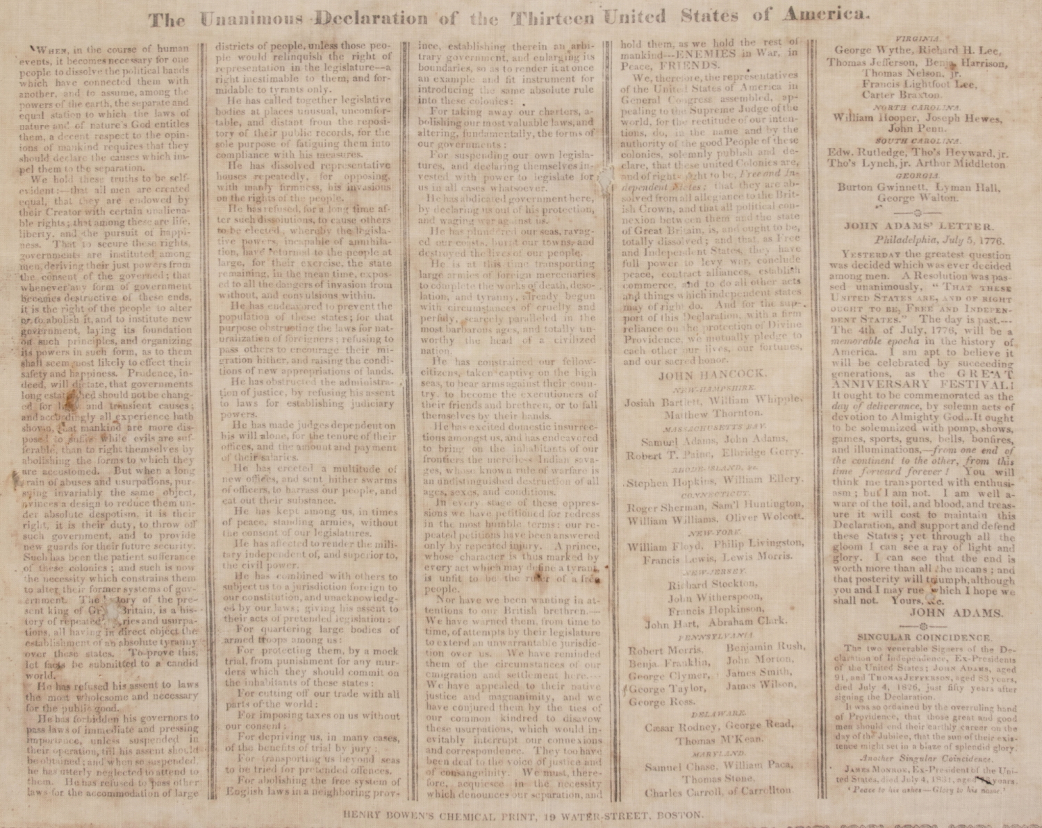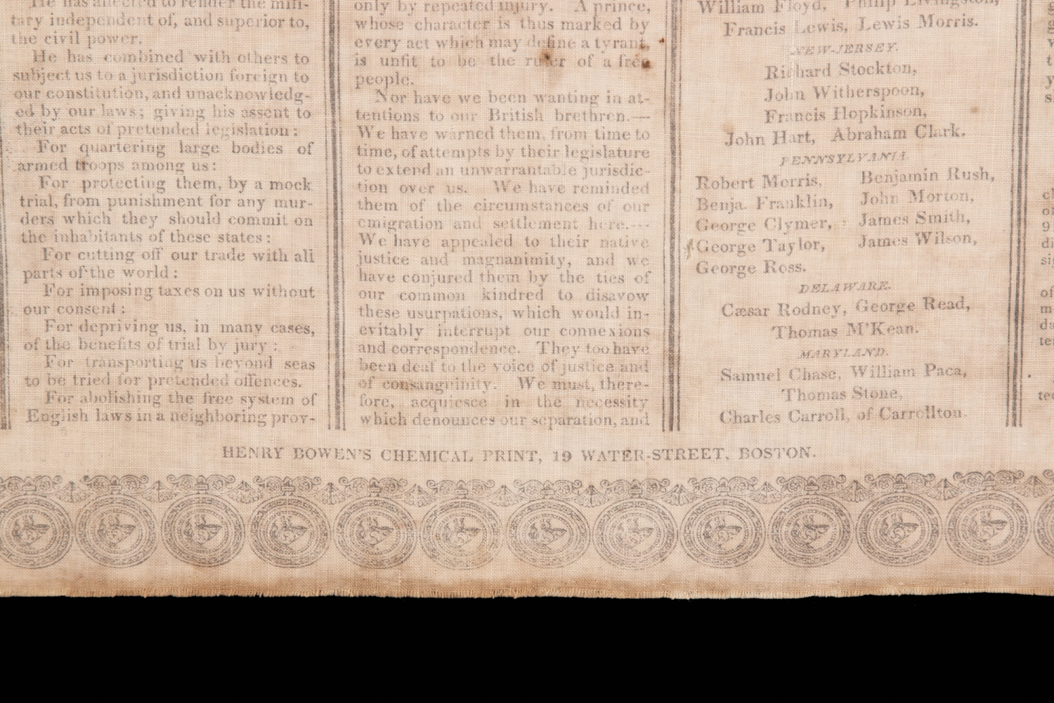 This printing of the Declaration of Independence, rendered in black ink on cotton, was produced in Massachusetts by the Boston Chemical Printing Company in 1832. Along the top register, within a border of conjoined rings, is an eagle in flight, carrying a streamer with the familiar Latin phrase “E Pluribus Unum” (out of many, one). This is flanked by fanciful wreaths of sea shells, flora & fauna, containing the words “In Congress July 4th, 1776” and “Of the Thirteen United States of America.”