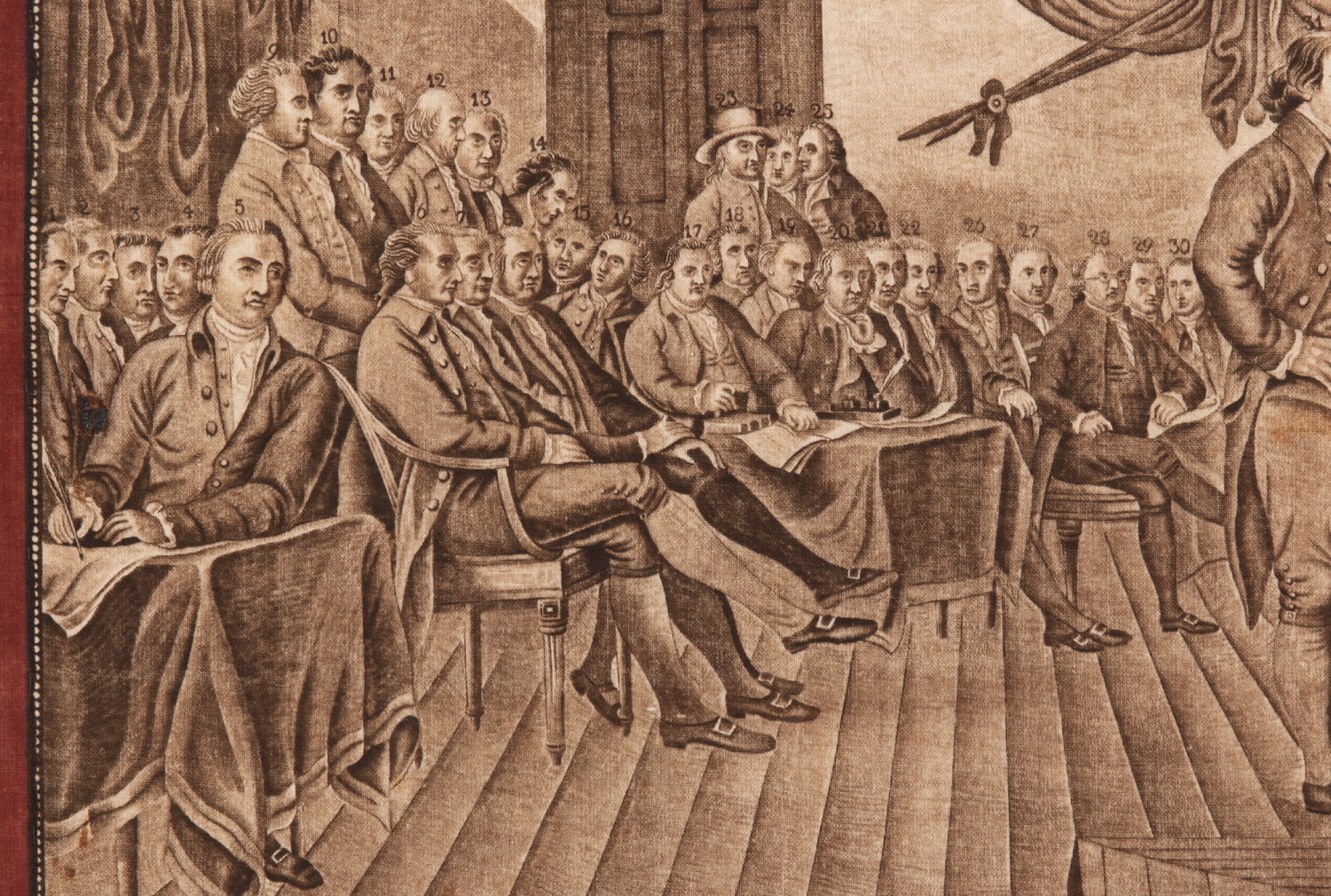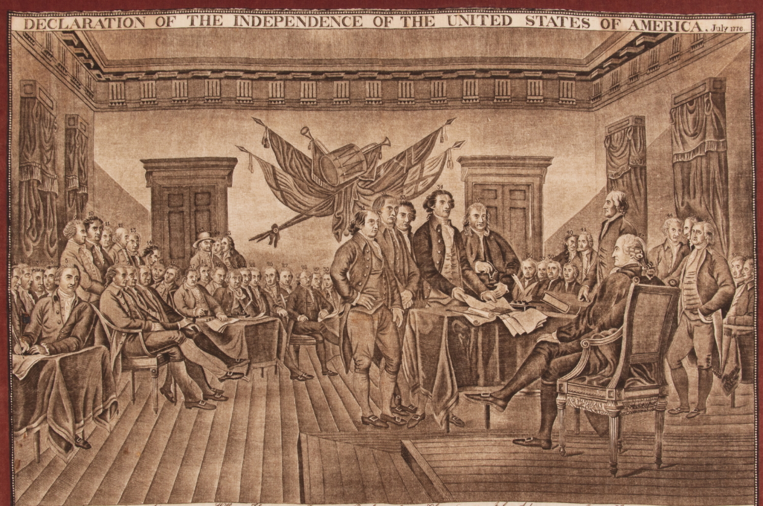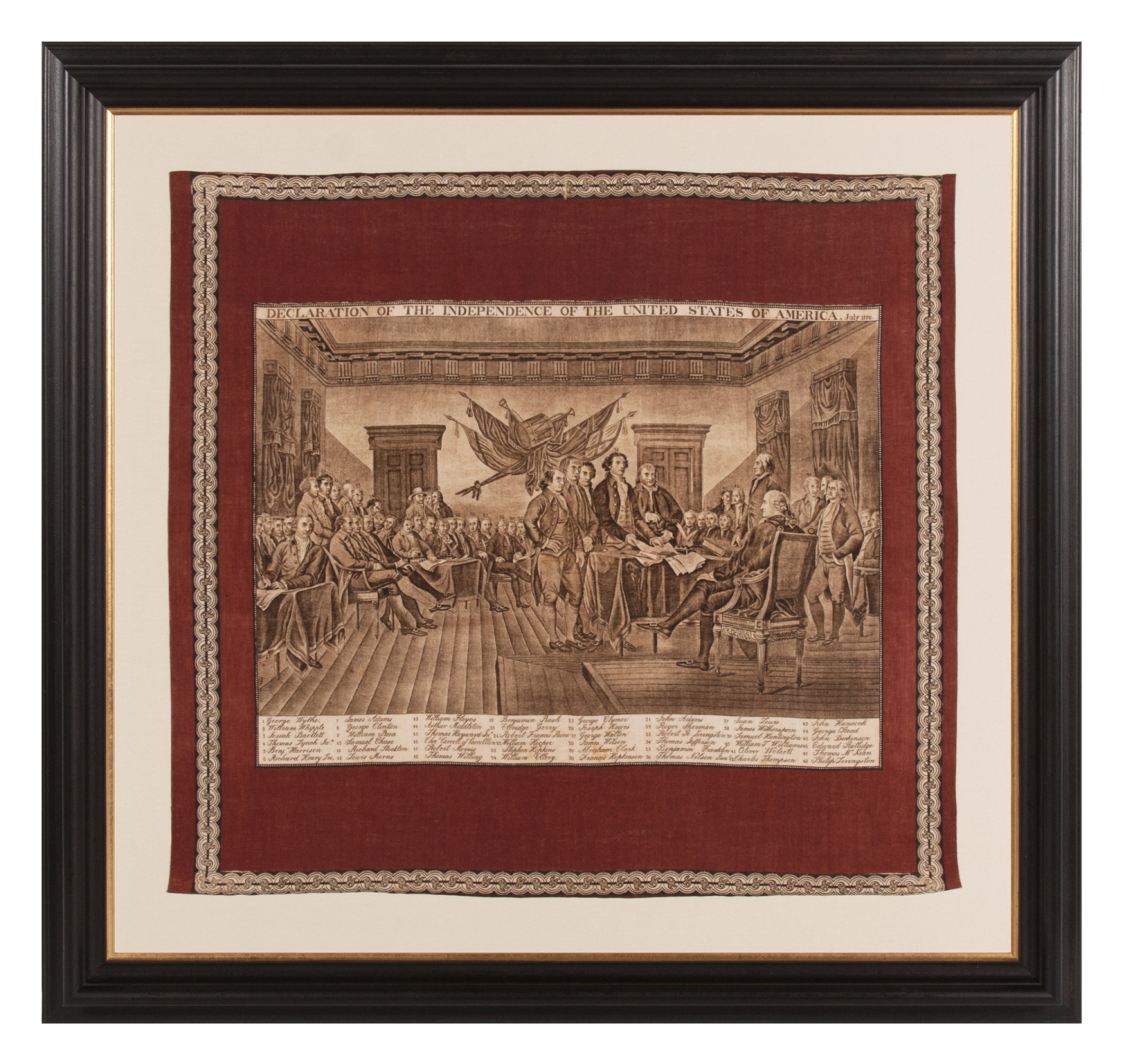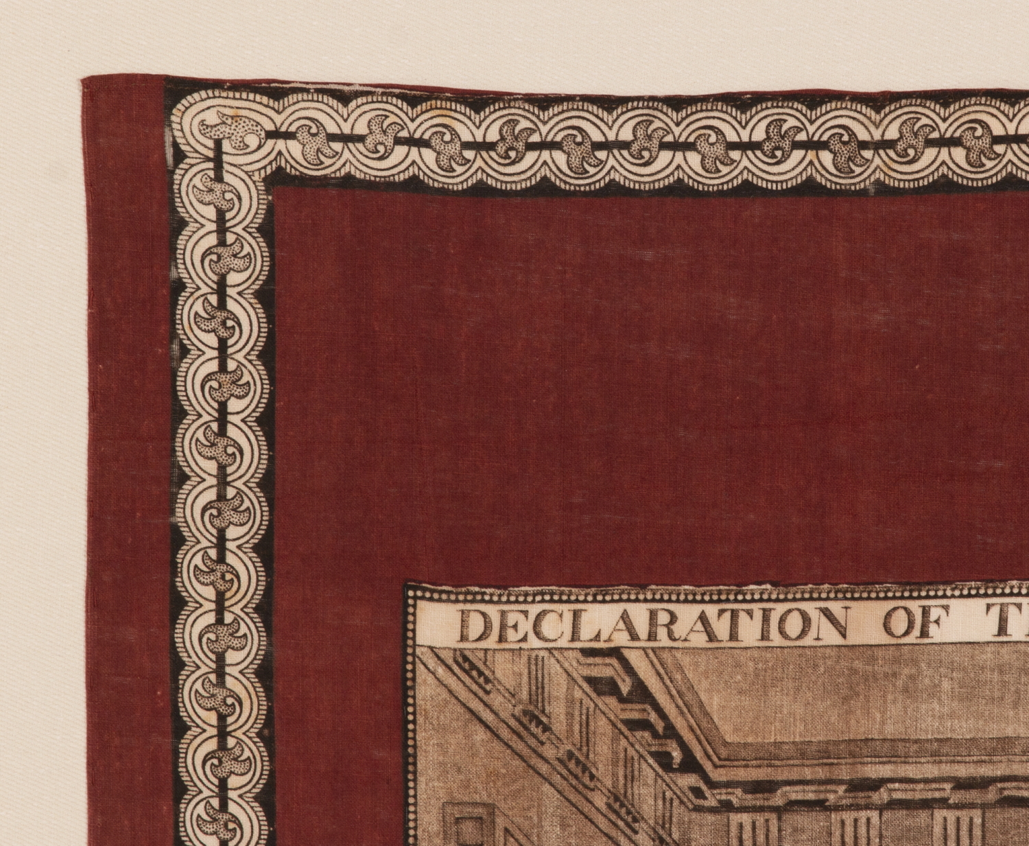 RARE, LARGE SCALE KERCHIEF WITH A BEAUTIFULLY ENGRAVED IMAGE OF JOHN TRUMBULL’S “DECLARATION OF INDEPENDENCE,” LIKELY MADE IN 1826 FOR OUR NATIONS SEMICENTENNIAL (50TH ANNIVERSARY); THE ONLY EXAMPLE I HAVE EVER SEEN OF THIS EXCEPTIONALLY RARE TEXTILE THAT RETAINS ITS ORIGINAL, RED COLORATION |