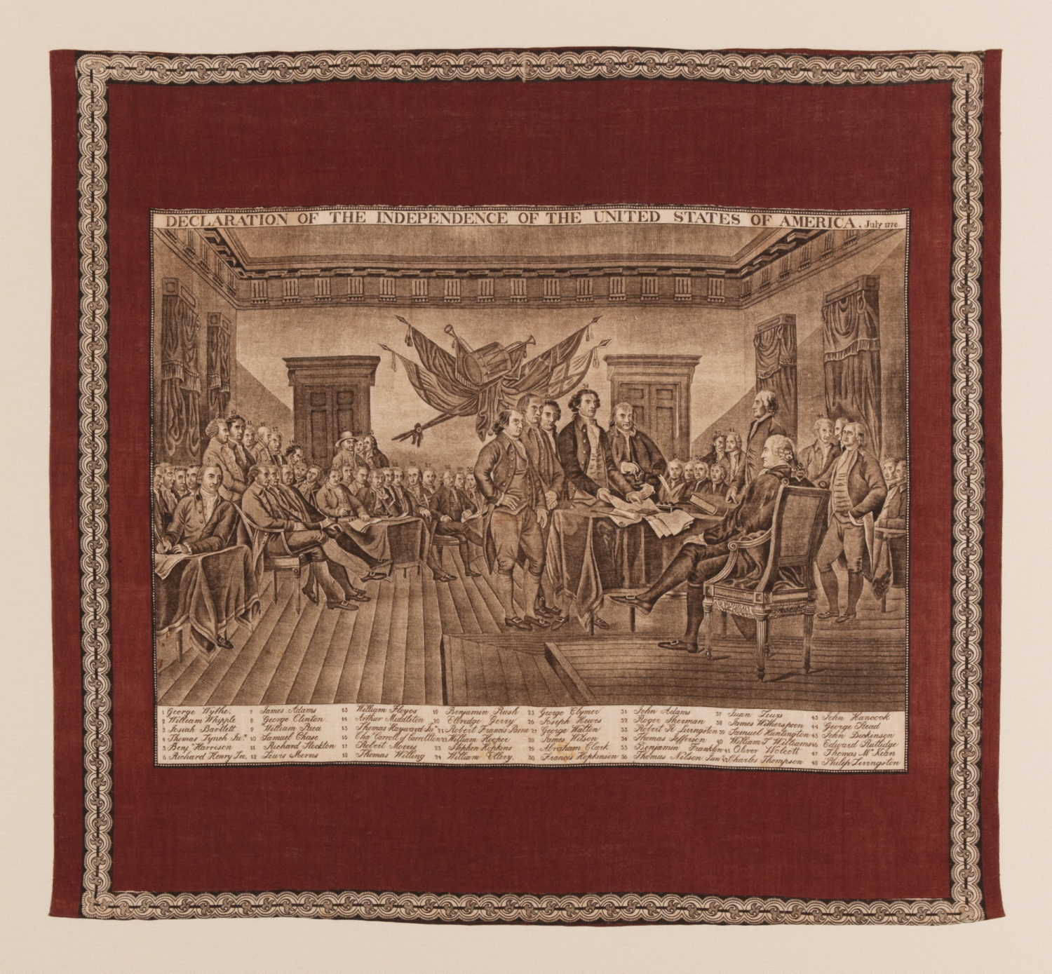 Printed on cotton, this extraordinarily detailed, large format kerchief pays respect to the Declaration of Independence through its depiction of the famous oil on canvas painting by John Trumbull, George Washington’s aide-de-camp and accomplished painter of historical views. Above the image is the following text: “Declaration of Independence of the United States Of America 4th July 1776.” Below is an accompanying legend that identifies each person by name in a generic script.