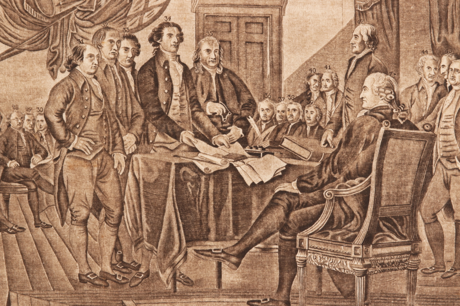On the original painting, many have noted that Jefferson’s foot, which is pointed at a somewhat odd angle, is purposely stepping on that of Adams. The two men were political enemies, so it is supposed that this was done on purpose. Close inspection, however, revealed that their shoes were merely close to one-another. Trumbull widened the distance in the Rotunda copy and a clear separation of their feet can be seen in the reproduction of the image on the kerchiefs. A curious historical fact is that Jefferson and Adams both left this world on July 4th, 2026, 50 years to the day after the document was formally adopted.