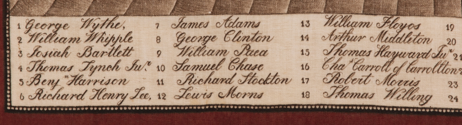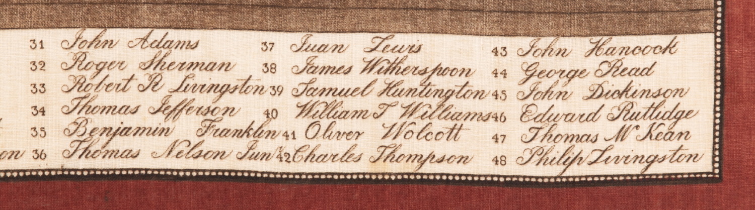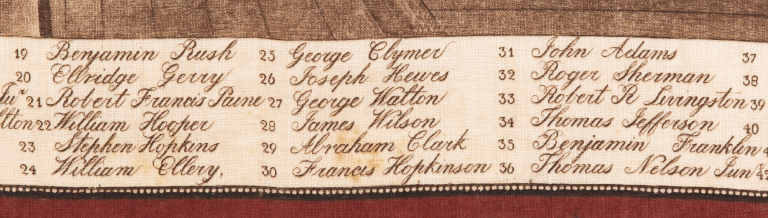 The Collins-documented kerchief was certainly produced by the same maker, and I suspect that the two variants to have been printed together, maybe even on the same bolt of fabric. The Collins version utilizes the same view of Independence Hall, except larger, with an expansive legend that identifies each man by way of a number and crude portrait, followed by facsimiles of their actual signatures.