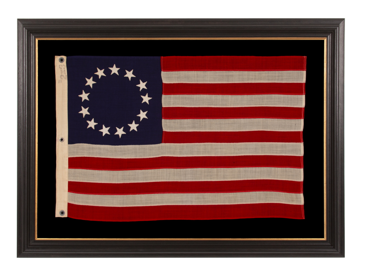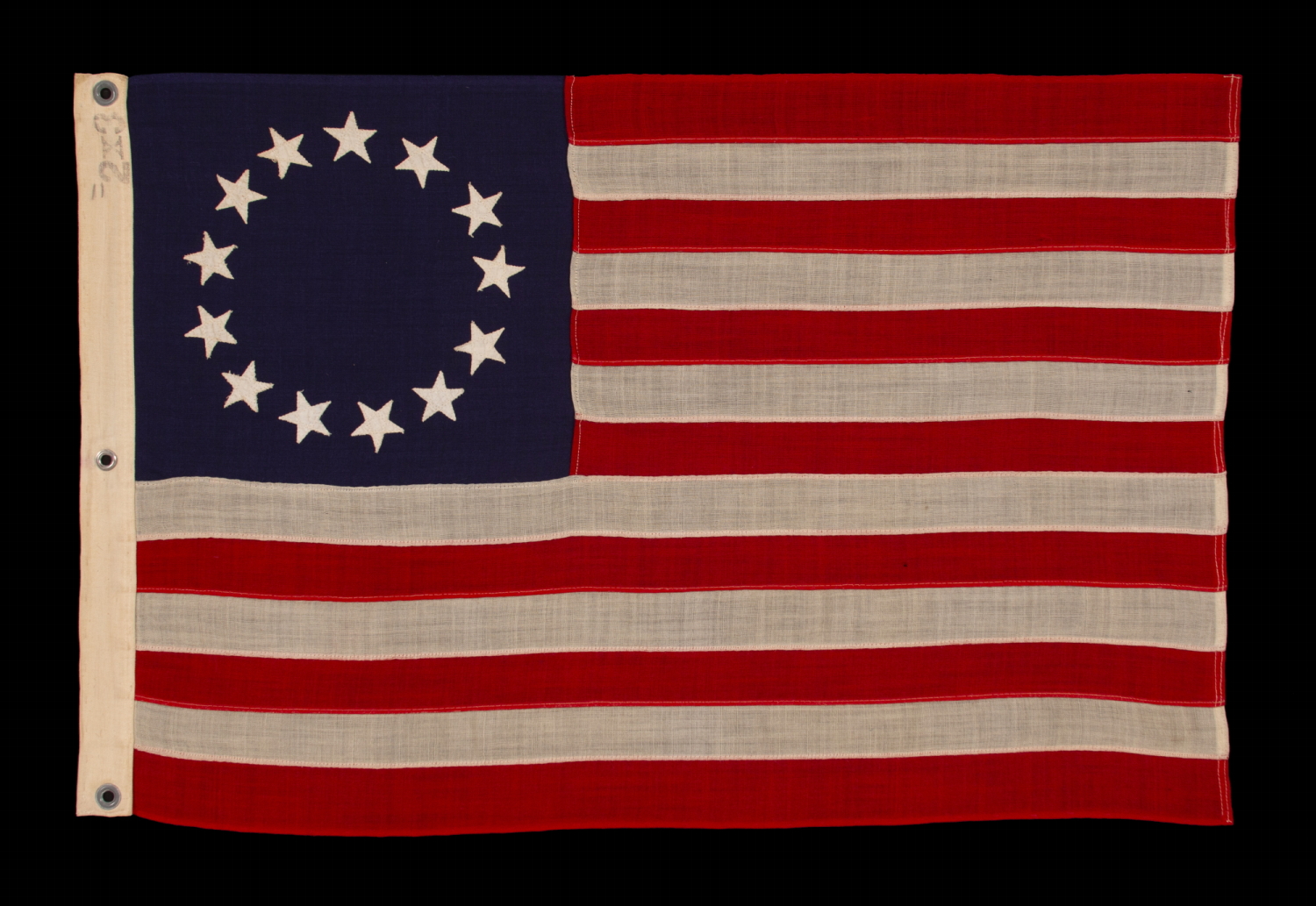 13 star flag of the type made from roughly the last decade of the 19th century through the first quarter of the 20th. The stars are arranged in the circular wreath pattern most often associated with Betsy Ross. Flags in this design are widely admired, due to the longstanding popularity of the Betsy Ross myth. While many Americans were taught in grammar school that this was what our first flag looked like, there is unfortunately no way to prove the claim. No colonial examples have survived with this pattern of stars. In fact, I have encountered just three surviving examples of Betsy Ross pattern flags that I believe to pre-date the 1890's.
