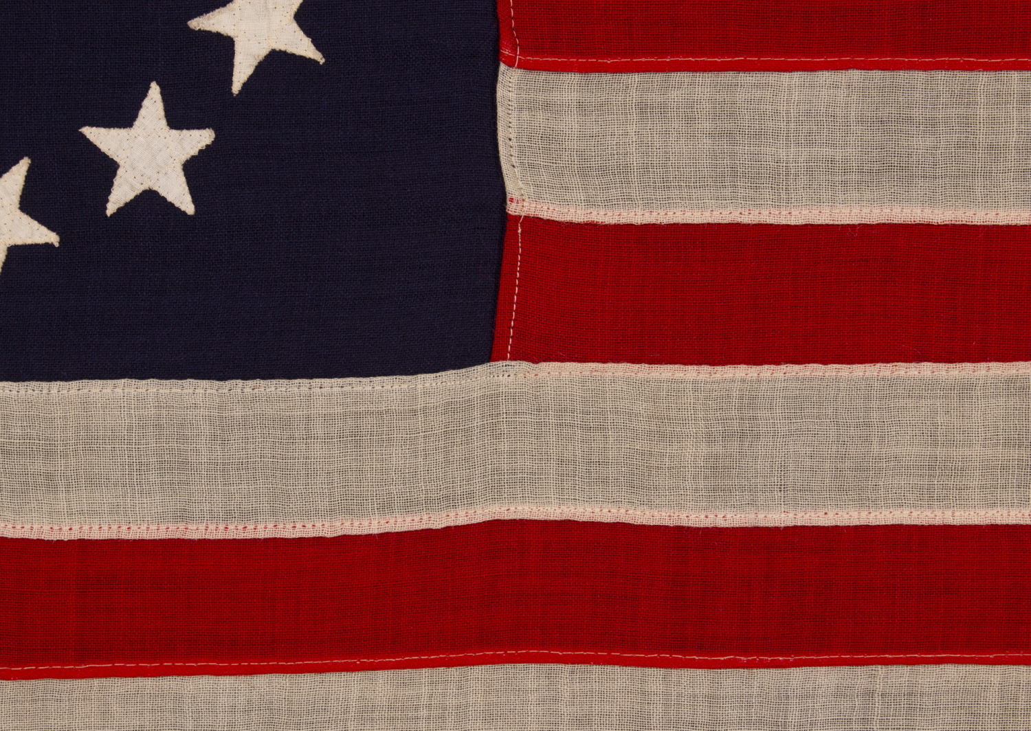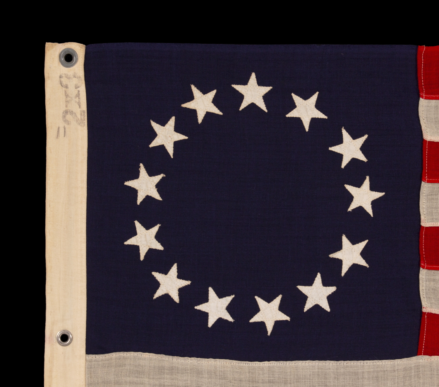 13 STARS IN THE BETSY ROSS PATTERN ON A SMALL-SCALE ANTIQUE AMERICAN FLAG MADE SOMETIME BETWEEN APPROXIMATELY 1910 AND THE 1926 SESQUICENTENNIAL OF AMERICAN INDEPENDENCE |