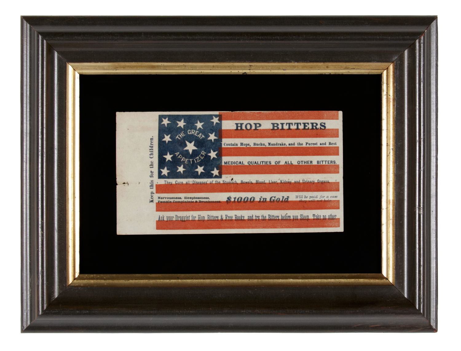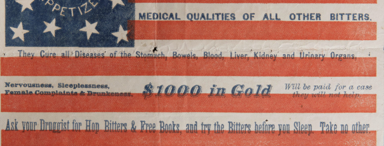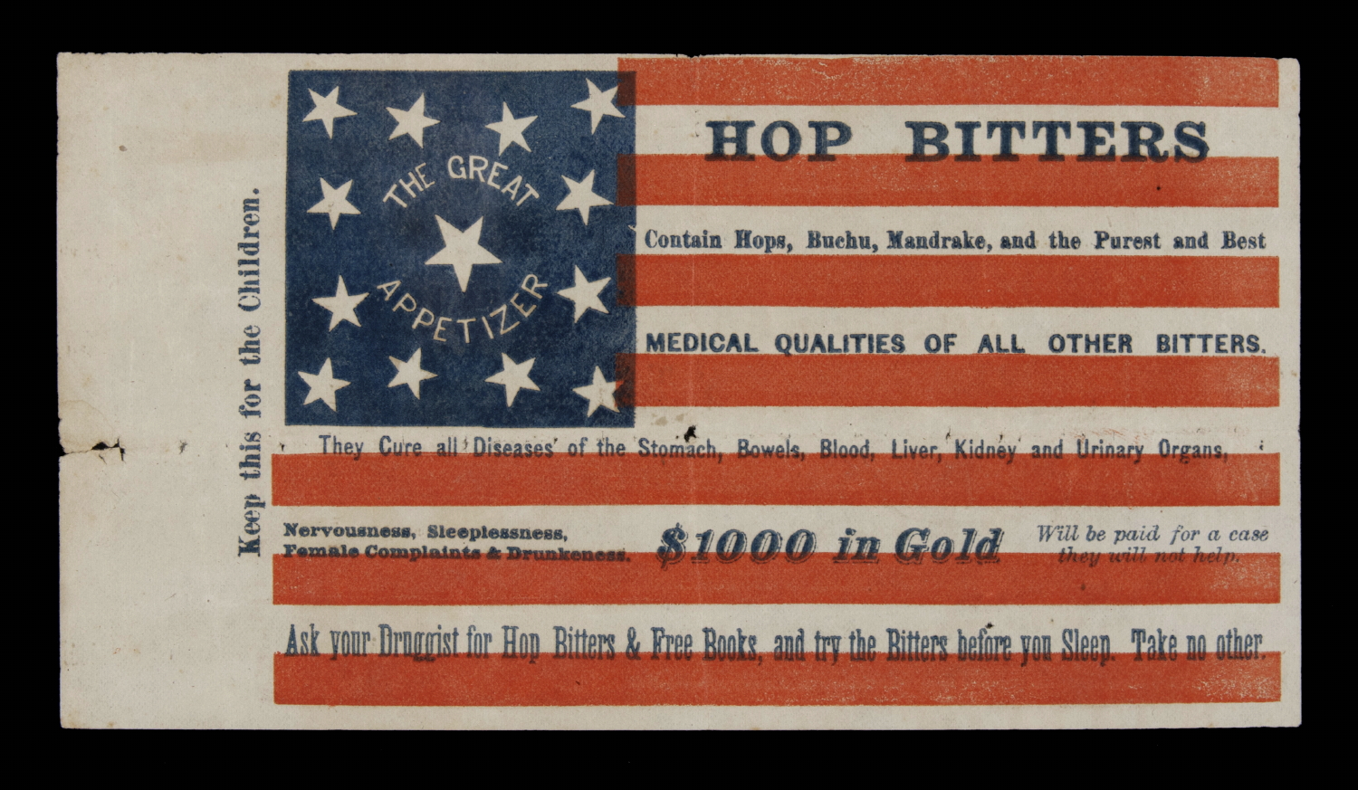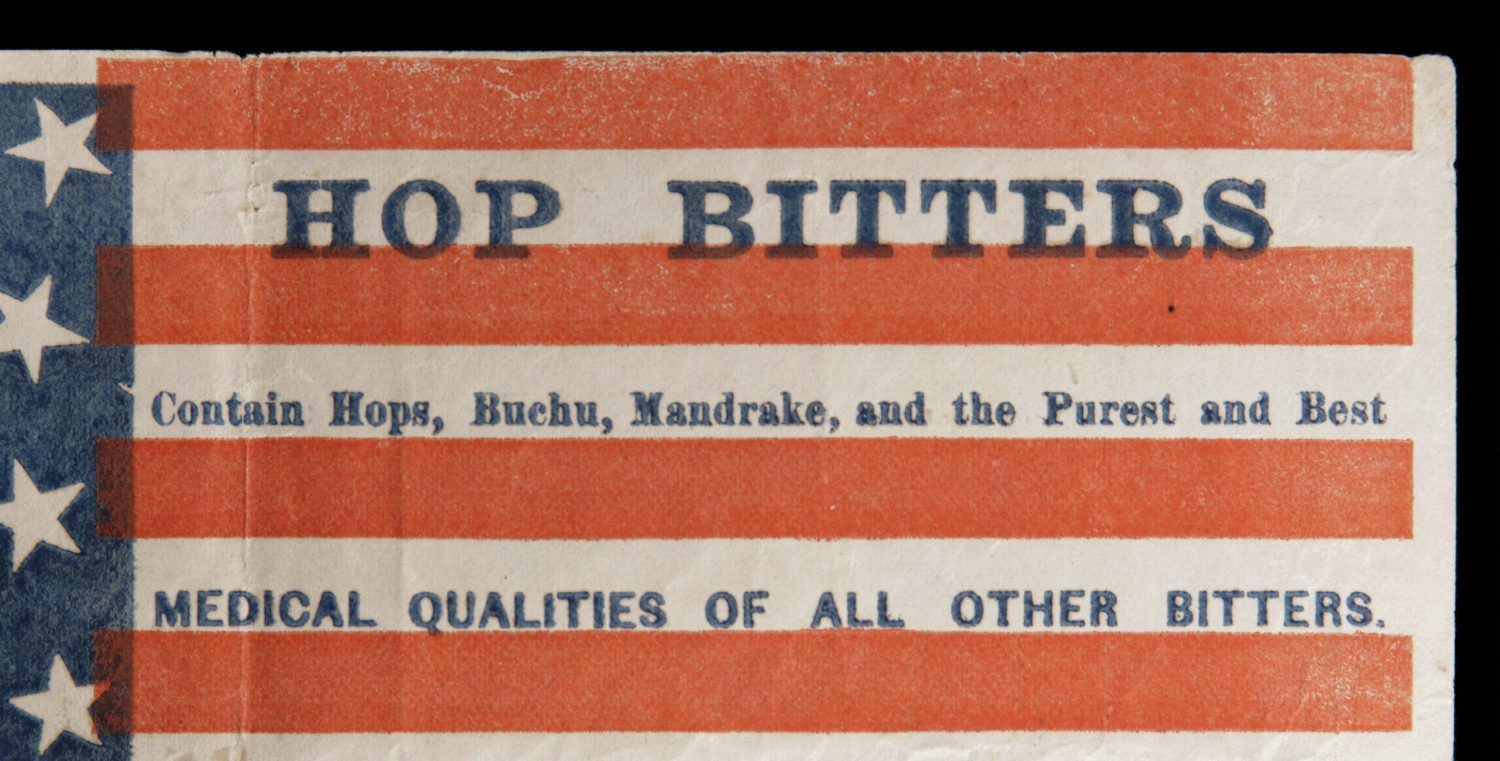 The canton contains 13 stars, tipped this way and that on their vertical axis, which may be viewed as either in a drawn square with elliptical sides, or as an octagon of stars flanked by a star in each corner, with a single star at the center. This is encircled by a billing for Hop Bitters that reads "The Great Appetizer."