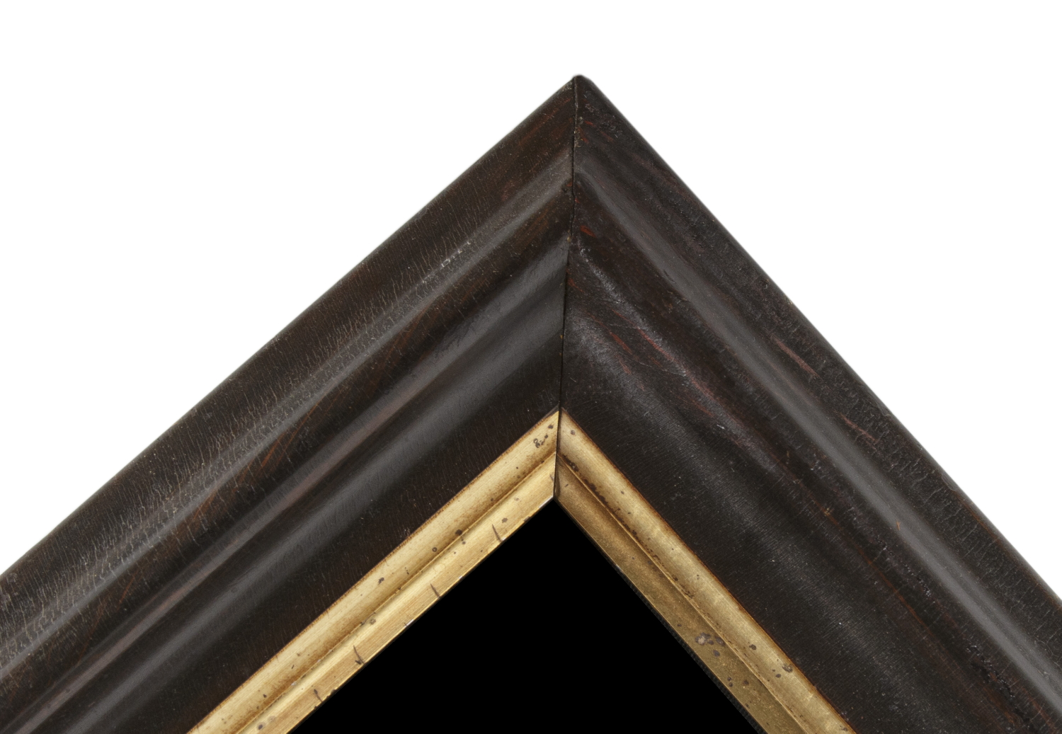 Mounting: The paint-decorated molding has a gilded inner lip and dates to the period between 1840 and 1870. This is a pressure mount between 100% cotton twill, black in color, and U.V. protective Plexiglas. The black fabric was washed to reduce excess dye. An acid-free agent was added to the wash to further set the dye and the fabric was heat-treated for the same purpose.