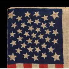 | 38 star American national parade flag, press-dyed on wool bunting, with an extremely unusual type of medallion star configuration. Specifically, this is triple wreath, with a small center star, surrounded by three consecutive rings of stars in the same size, with a large flanking star in each corner of the blue canton. 19th century flag-makers loved to use multiple sizes of stars in circular arrangements, often with no other purpose than to create an eye-catching, artistic presentation. In this light, the characteristic of having large corner stars is in no way uncommon, popular on wreath pattern flags. However, in the course of my 25-year obsession with fantastic star designs on early American flags this is the only instance of a wreath configuration, with larger corner stars, that lacked a star of equivalent size or greater in the center. Many fantastic star patterns were made in the patriotism that accompanied or nation’s 100-year anniversary of independence in 1876 and this is one of the most interesting examples. Because there were no regulations concerning either star configuration or position until 1912, and many flag-makers went out of their way to catch the attention of potential buyers. The absence of a big center star makes for a visually unusual flag among its counterparts of the centennial era. Note how the somewhat crowded arrangement of the wreaths adds to its interesting appearance, as does the beautiful blue color of the square canton, that contrasts wonderfully with the scarlet red of the stripes. The combination of all the above contributes to a bold visual display. Colorado became the 38th state on August 1st, 1876. This was the year of our nation’s 100-year anniversary of independence. Per the Third Flag Act of 1818, stars were not officially added until the 4th of July following a state's addition. For this reason, 37 was the official star count for the American flag in 1876. Flag-making was a competitive venture, however, and few flag-makers would have continued to produce 37 star flags when their competitors were making 38’s. It is for this reason that 38 and 13 stars (to represent the original 13 colonies) are more often seen at the Centennial Expo. Some flag-makers would have been adding a star for the 38th state even before it entered the Union, in the early part of 1876 or even prior. In fact, many makers of parade flags were actually producing 39 star flags, in hopeful anticipation of the addition of two more Western Territories instead of one. The 39th state would not join the Union for another 13 years, however, when the Dakota Territory entered as two states on November 2nd, 1889. The 38 star flag became official on July 4th, 1877, and though it remained so until July 3rd, 1890, flags in this star count would have fell from use with the addition of the Dakotas. This particular flag is of a known type, made by Made by Horstmann Brothers of Philadelphia, a major Civil War military outfitter. Horstmann produced its own press-dyed wool flags, some of which it marked with its name along the hoist. Like most 19th century flag-makers, however, it marked only tiny fraction of what it produced. This particular style of Horstmann flag is especially rare. It is of interest to note that the firm was producing press-dyed flags with other star patterns simultaneously, one of which shared the trait of having large corner stars, but lacking a large center star. That variety bore no single star at all, and was not a triple wreath, instead displaying an odd, flattened ellipse of 6 stars in the center, canted at an odd angle, surrounded by two circular wreaths. Another variant, produced in at least 3 sizes, displayed an enormous center star, surrounded by a wreath, surrounded by a square of stars. At least two other known types displayed their stars in lineal rows. Because of its Philadelphia location, Horstmann was in a unique position to supply flags and banners to the 1876 Centennial International Exposition, our nation’s first World’s Fair, that served as the nucleus of the national celebration of America’s 100th birthday. Horstman played an integral role in decorating the enormous, six-month long event, which required flags that would last much longer than the typical cotton or silk parade flags, produced with the intent of short term use at parades, political rallies, reunions of Civil War soldiers, and the like. 225 buildings were erected to host the exhibits and accompanying necessities, most of which required extensive decoration of all types, the artistic presentation of which was simply beyond imagination. Because wool sheds water, cotton absorbs it, and silk, while elegant, was likewise not a durable fabric for exposure to the elements, press-dyed wool flags were rather ideal for the long-term display the Centennial Expo required. All-in-all, a really terrific example for a collector or a one-time buyer, alike, with wonderful presentation. A Brief History of the Horstmann Company: William H. Horstmann (1785-1850) was the founder of what would become a major military outfitter in both Philadelphia and New York City. A solider and fourth generation passementier (textile weaver), Horstmann emigrated to the United States from Cassel, Germany in either 1815 or 1816, settling in the Germantown area of Philadelphia, where there was a significant concentration of textile manufacturing. Horstmann established a business of manufacturing fringe, laces, and trimmings at 50 N. Third St. and soon after married the daughter of Frederick Hoeckly, the most successful lace manufacturer in the city. In 1824 he introduced three significant tools to America, including the first jacquard loom, for weaving multicolored fabrics, the first braiding machine, and a machine for plating metal. Moving to the corner of 59th & Third, he imported technology from Germany and elsewhere and maintained regular trade with his family in Europe. The company grew exponentially in size and 