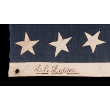 38 STARS IN CRUDE COLUMNS WITH HAPHAZARD ORIENTATION, ON AN ANTIQUE AMERICAN FLAG WITH A BEAUTIFUL, SLATE BLUE CANTON, SIGNED "LEDDON," MADE IN THE ERA WHEN COLORADO WAS THE MOST RECENT STATE TO JOIN THE UNION, 1876-1889 |