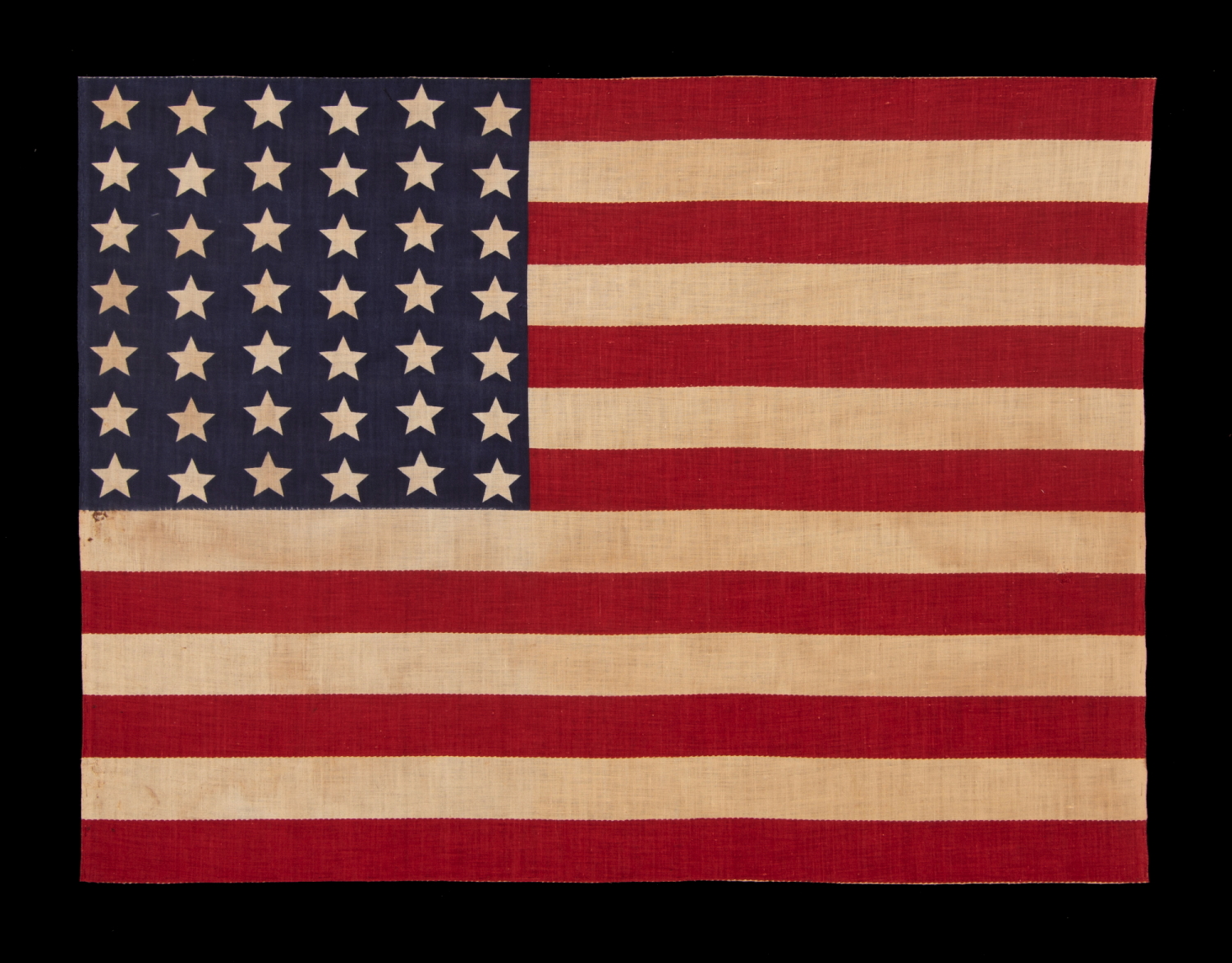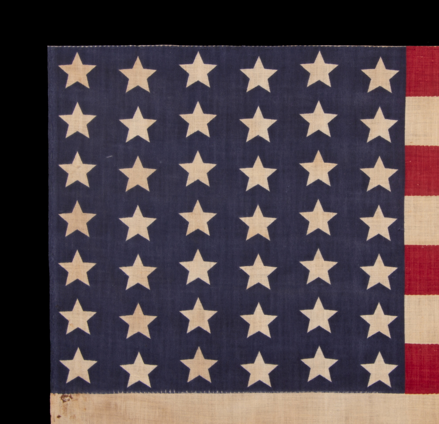 | 42 STARS ON AN ANTIQUE AMERICAN FLAG WITH A WAVE CONFIGURATION OF LINEAL COLUMNS, AN UNOFFICIAL STAR COUNT THAT REFLECTS THE ADDITION OF WASHINGTON STATE, MONTANA, AND THE DAKOTAS, circa 1889-1890 |