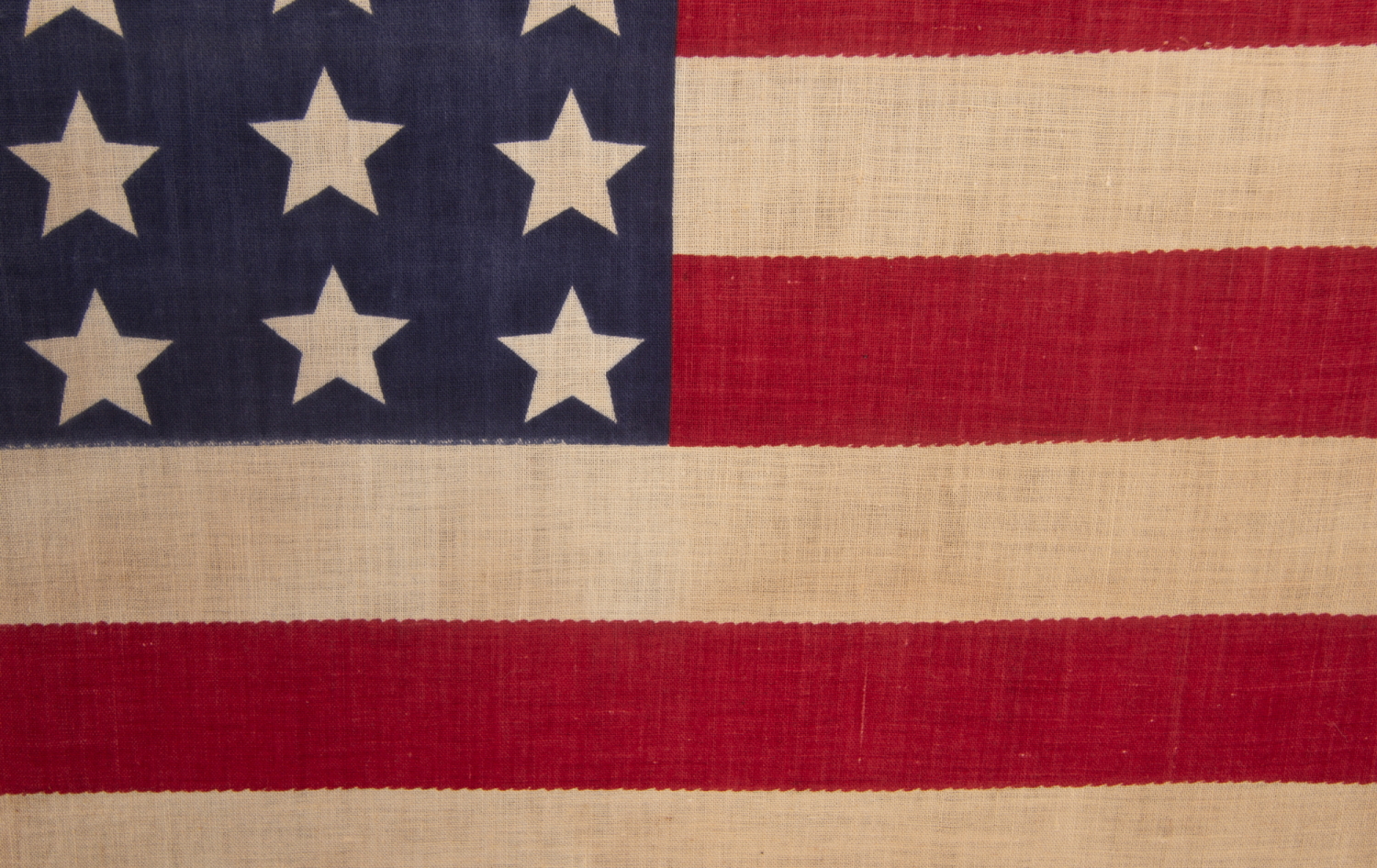 | 42 star American parade flag, printed on cotton. The stars are arranged in what is called a “wave” configuration. Note how these stars are placed in columns, which are slightly offset at alternating heights. The 42 star flag is interesting from a historical perspective, both because 42 was never an official star count, and because 42 star flags were only produced for about 8 months (November, 1889 – July 4th, 1890). The flag represents the addition of the Dakotas, Montana and Washington State, between November 2nd and November 11th, 1889. The 42nd state was officially Washington, but the four states gained their statehood only nine days apart, and flag makers added 4 stars, accordingly, to the count of 38 that was official at the time. After 1818, star counts became official on the 4th of July each year. A new star was therefore officially added on Independence Day for every state that had been added over the preceding “flag year”. Flag makers, however, did not wait for July 4th and official star counts. Flag production was a competitive industry and no one wanted to be making 38 star flags, for example, when their competitors were making 42 star examples and there were 42 states. Idaho joined the Union on July 3rd, 1890, taking the star count to 43 just one day before 42 would have become the official number. This fact makes 42 star flags an interesting part of our heritage and a classic display of American capitalism. Mounting: For 25 years we have maintained a specialized department for this purpose. Our lead conservator holds a master's degree in textile conservation from one of the nation’s top university programs. We take great care in the mounting and preservation of flags and related textiles and have preserved thousands of examples. The background is 100% cotton twill, black in color, that has been washed and treated for color fastness. The substantial, contemporary burled molding has a convex profile and a Ralph Lauren sensibility, with a surface reminiscent of old leather. To this a high quality gilded molding, with a step-down profile, was added as a liner. Spacers keep the textile away from the glazing, which is U.V. protective glass. Feel free to contact us for more details. Condition: There is minor to modest golden brown oxidation throughout, accompanied by a few flecks of staining at the hoist end of the 4th white stripe, just below the canton. Many of my clients prefer early flags to show their age and history of use. |