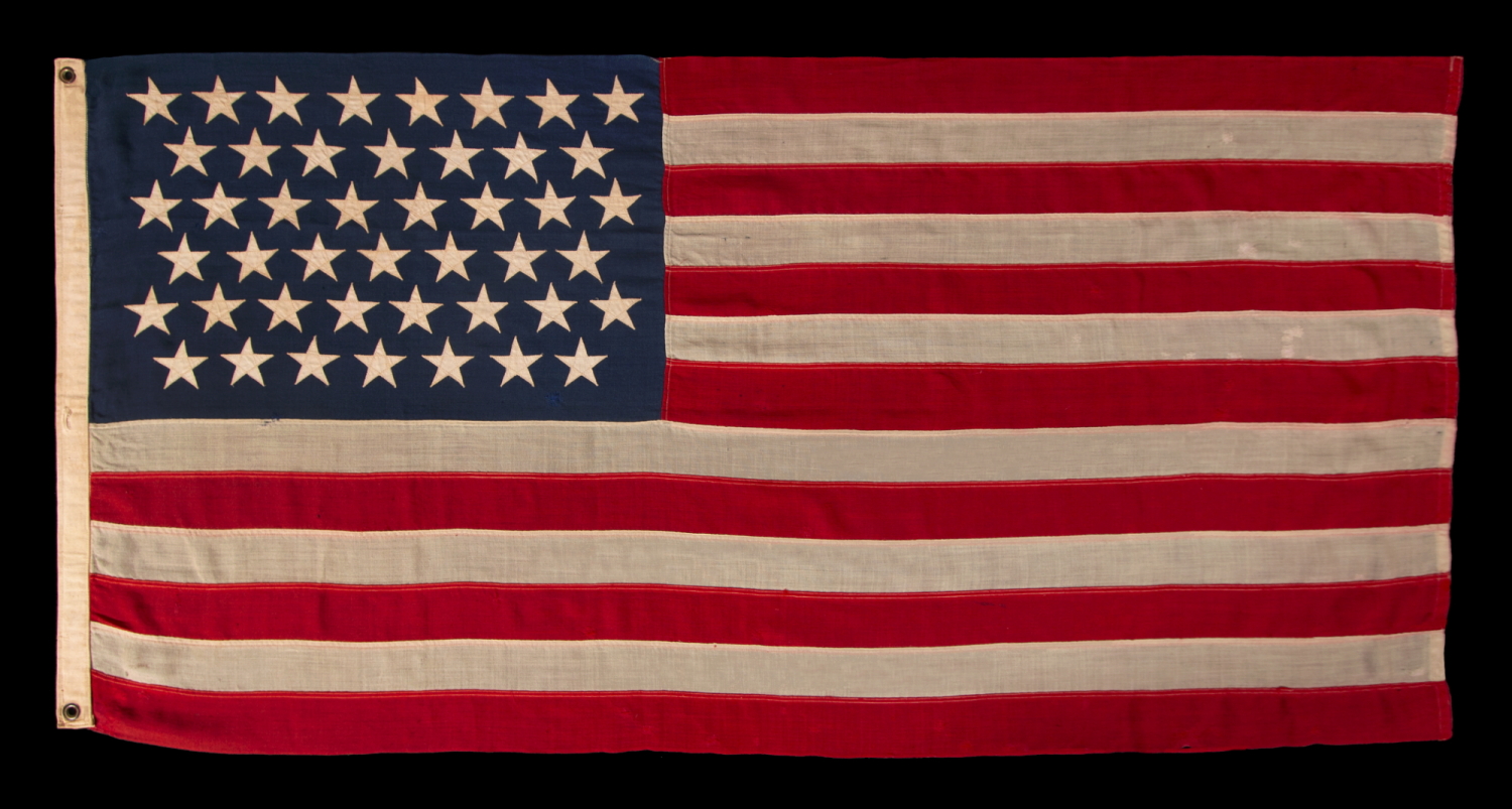 | 45 STARS ON AN ANTIQUE AMERICAN FLAG OF THE 1896-1908 ERA, REFLECTS THE ADDITION OF UTAH AS THE 45TH STATE; SPANISH-AMERICAN WAR ERA; AN ESPECIALLY BEAUTIFUL EXAMPLE WITH LARGER STARS THAN MOST AND EXCEPTIONAL, TRADITIONAL SHADES OF SCARLET RED AND NAVY |