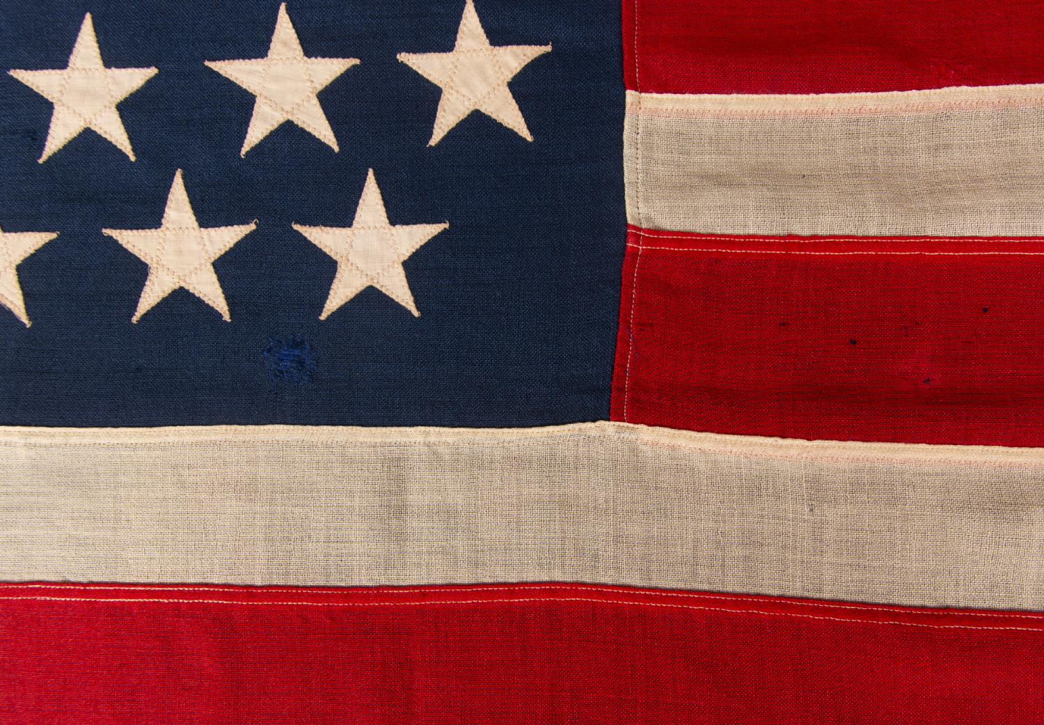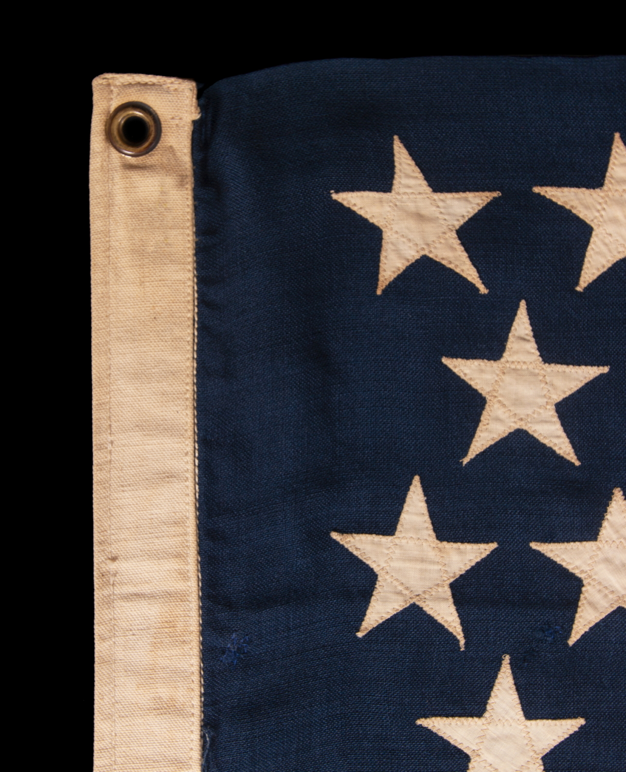| 45 star American national flag, with a staggered row configuration of stars and in a relatively small size among its sewn counterparts of the period. Utah became the 45th state on January 4th, 1896. It had been attempting to gain statehood for many years, but remained a territory primarily due to the fact that the Mormon Church and Utah authorities continued to be openly tolerant of polygamy. In 1890, Mormon Church President Wilford Woodruff published a manifesto that denounced the contract of “any marriages forbidden by the law of the land,” which paved the way to Utah’s 1896 acceptance. Following the Third Flag Act, accepted by Congress in 1818, stars were to be officially added on Independence Day for any states that had been added over the previous “flag year.” The 45th star was thus officially added on July 4th, 1896, and although 45 remained the official count until July 3rd, 1908, 45 star flags would have generally fallen from production in 1907, when Oklahoma joined the Union as the 46th state. Flag-makers both public and private cared little for official star counts, instead producing what made sense from a practical standpoint, sometimes even adding stars bore the respective states were added, in hopeful anticipation. Presidents who served during this period were Democrat Grover Cleveland, in his second, non-consecutive term, the two terms of Republican William McKinley, the second of which was cut short by his assassination (shot 09/06/1901, passed 09/14/1901), and the two terms of Theodore Roosevelt, the first of these attained by ascension. Due to the Spanish-American War (1898) and Teddy Roosevelt’s famous world tour of the “White Fleet” (launched in 1907), this was an extremely patriotic period. One of the flag's attractive features is its relatively small scale among those with of pieced-and-sewn construction. Prior to the 1890's, flags with sewn construction tended to be very large in comparison to those of today, in order that they may serve well in their utilitarian function as signals that needed to be properly identified from a distance. Lengths of 8-feet on the fly and longer were common. A six-foot flag, such as this one, was considered small. After 1890, flag-maker's began for the first time to produce sewn flags in quantity that measured 3-4 feet on the fly. However, these almost always featured 13 stars, as opposed to a count that represented the full complement of states at the time. It wasn't until well until the 48-star period (1912-1959) that sewn flags of this scale often bore the full star count. On the whole, collectors prefer flags that can be more readily conserved and displayed in modern indoor setting. Construction: The canton and stripes of the flag are made of wool bunting that has been pieced with a lineal machine stitch. The stars are made of cotton and double-appliquéd (sewn to both sides) with a zigzag machine stitch. These are arranged in staggered rows of 8-7-8-7-8-7, which is typical of this star count. There is a sailcloth canvas binding along the hoist, two brass grommets, one each at the top and bottom. A vertical slit, cut by the flag’s owner in the middle of the binding, served as a crude, third grommet, of sorts, to aid in cinching a rope into position, perhaps so that the flag could at some point be hung vertically with better support. Mounting: The flag was mounted and framed in our own conservation department, which is led by expert staff. We take great care in the mounting and preservation of flags and have framed thousands of examples. The black-painted, hand-gilded and distressed molding is Italian. The glazing is U.V. protective acrylic (Plexiglas). Feel free to contact us for more details. Condition: There is a scattering of darning repairs within the white stripes, within the last ¼ of the flag’s length on the fly. There are a few tiny holes and losses and there is extremely minor staining. The overall condition is exceptional for a wool flag of the period, the colors are bright, and the flag presents beautifully. |