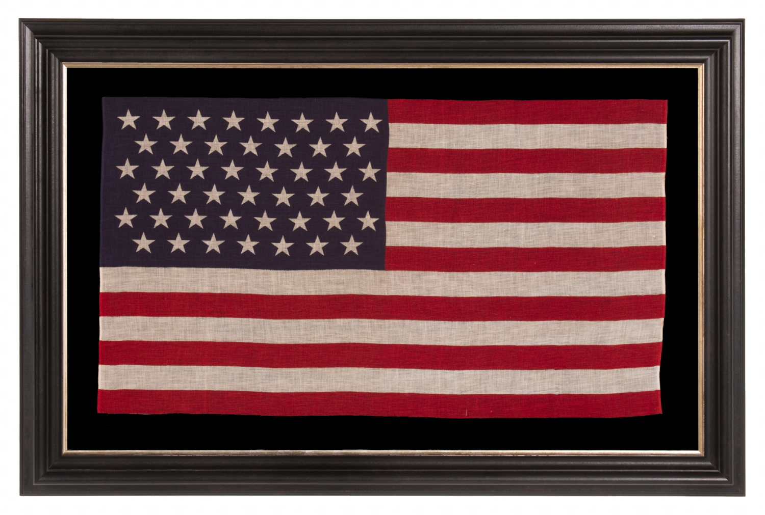 Although this technically remained the official star count until July 3rd, 1908, the 45 star flag was generally used from that year until 1907, when Oklahoma joined the Union. Due to the Spanish-American War (1898) and Teddy Roosevelt’s famous world tour of the “White Fleet” (launched in 1907), this was an extremely patriotic period.