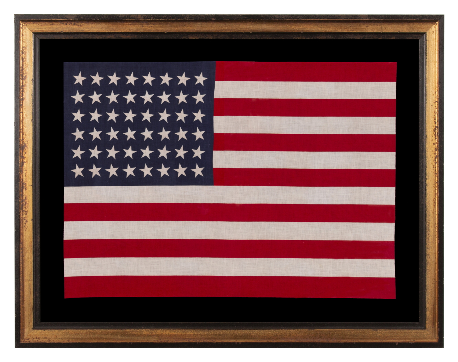 Based on my extensive experience with printed parade flags, and comparison to many other known examples, my educated guess is that this variety may well pre-date the addition of the 47th and 48th states. Some 48 star flags have been found with hand-written and printed dates ranging as early as 1896, a full 16 years before we actually reached that number. At this time there were 4 more Western Territories yet to be added and it was well known that they would eventually gain statehood. From the Civil War onward, it was actually common for flag-makers to produce flags with anticipatory counts like this, including more stars with hopes to influence people to buy new flags.