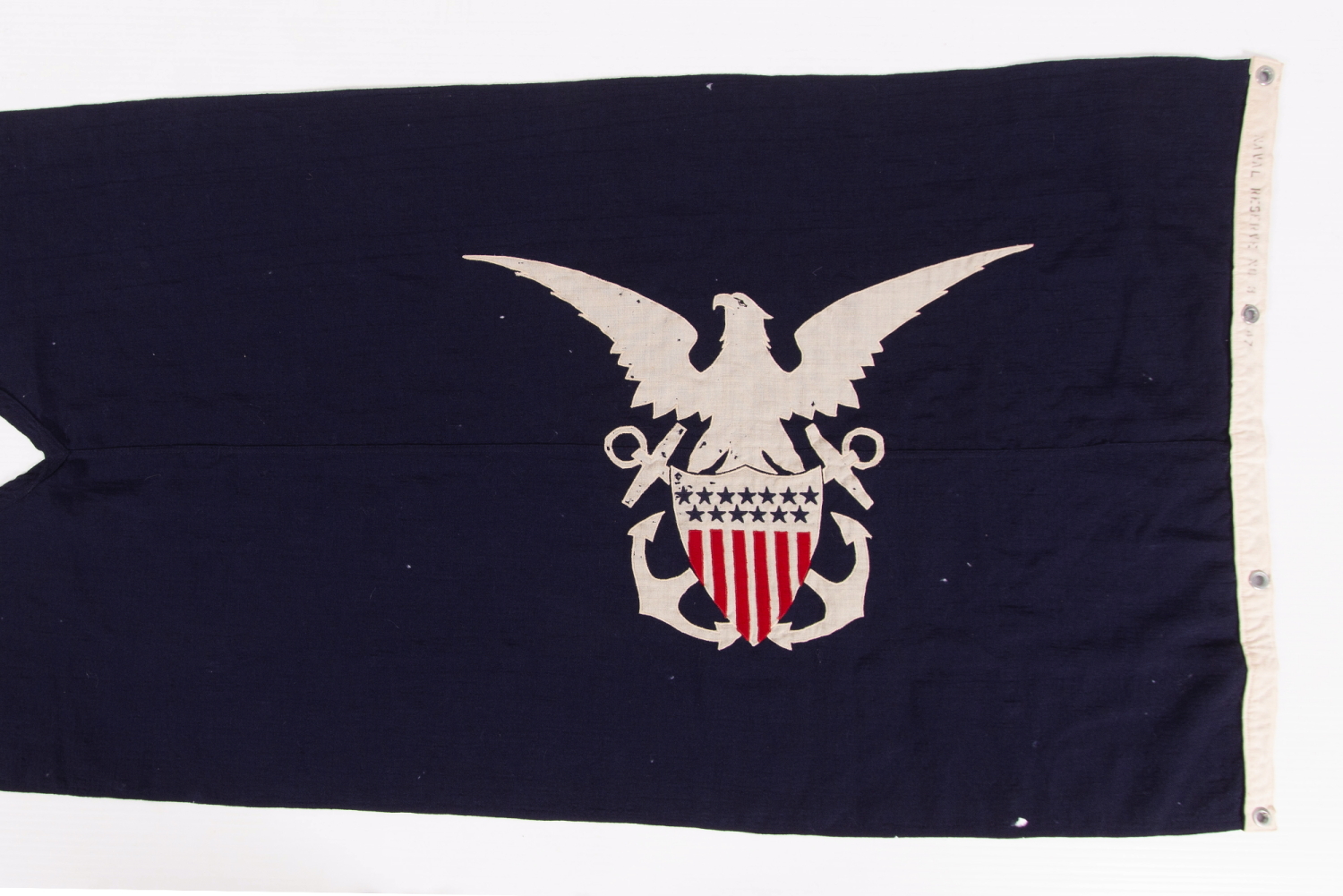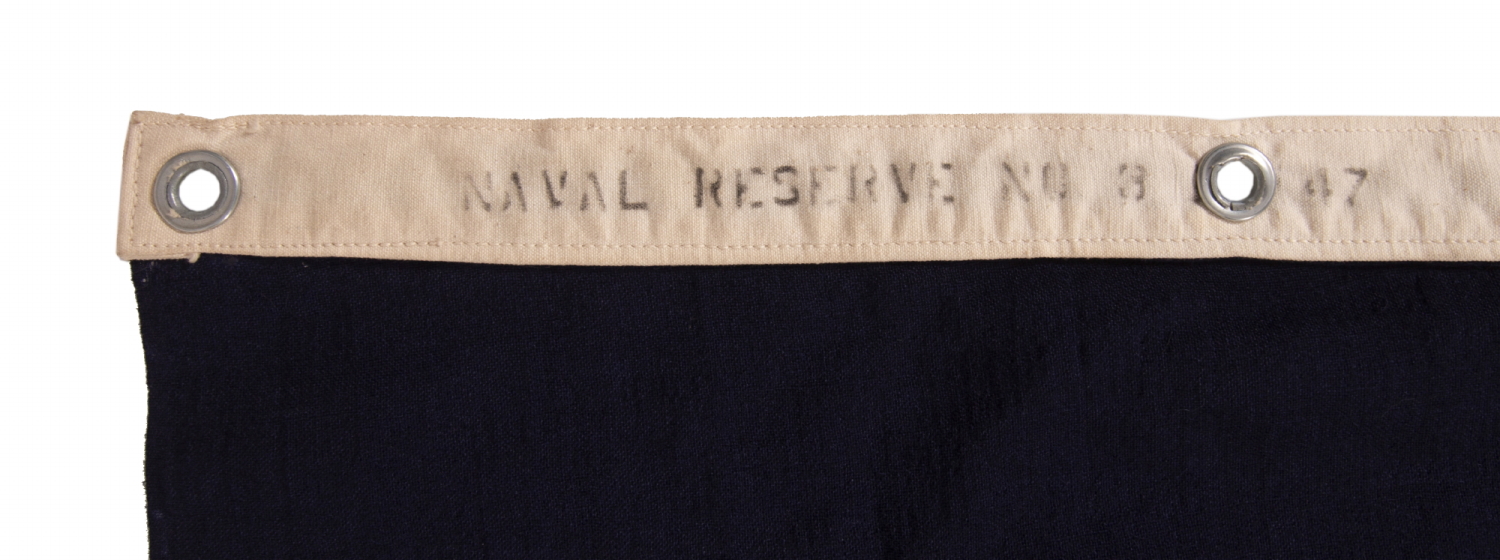 The U.S. Naval Reserve Force Merchant Marine pennant was authorized by way of U.S. Navy General Order No. 285 on April 14th, 1917. The purpose of the signal is to be flown aboard ships in port, during wartime, that have been approved by the Secretary of the Navy as suitable for wartime service. Craft sanctioned for this line of duty were limited to those where both the commander, and at least half of his/her subordinate officers, were members of the U.S. Naval Reserve Force. The combination of the shape and color of the flag, and the device itself, are, together, stunningly beautiful. Something about the arch of the upward-stretched wings, the raised brow of the eagle’s shapely crown, and its dominance over the comparatively narrow profile of the shield and crossed anchors, in combination with the contrast of white and red against navy blue, on the sleek form of the large pennant, with its deep, forked swallowtail, makes for a artistically powerful piece of American flag-making and history. The blue ground is constructed of wool bunting that has been pieced and hemmed by machine. All of the elements of the device are made of wool bunting and are double-appliqued (applied to both sides) with a zigzag machine stitch. The eye of the eagle was machine-embroidered. There is a sailcloth canvas binding along the hoist, with 4 white metal grommets, along which, on the reverse, a black inked stencil reads: “NAVAL RESERVE NO 3 MI 47.” The distinction “No 3” corresponds to a size designation employed by the navy on all of its signals. Though the initials “MI,” though largely blocked by the hole and grommet that cover them, is a known and expected mark for a Navy flag of this era. Located on the western edge of the City of Vallejo, about 23 miles northeast of San Francisco, Mare Island (actually a peninsula) served as a principal seat of U.S. Navy defense, beginning in the mid-19th century. The Navy made its own flags at this location, which they generally signed and dated. “47” denotes manufacture in 1947, in the wake of WWII (U.S. involvement 1941-45). In theory, the proximate use of this flag was very large. Warranted during WWI, the design is still authorized today, more than 100 years hence. Thousands of ships are likely to have qualified to be flagged with the signal, though in spite of these facts, I had never before seen an example of it until I acquired this one. Origins of the U.S. Navy, the Merchant Marine Reserve, and the U.S. Navy Reserve: The roots of merchant marines in America can be traced to at least the early 18th century, in the citizen sailors who acted at times of need to protect merchant ships from piracy. When the Revolution began, in 1775, most of the men gathered to serve in the Continental Navy, to man the scattering of purchased, leased, and captured vessels, of which it was comprised, were paid merchantmen as opposed to enlisted and commissioned sailors. Without the financial resources to build ships, the total number of craft employed by the Continental Navy during the war was 66, and the maximum at one point during the war was 31 (1777). The importance of trade and the transport of supplies was keenly understood by our forefathers. One in four signers of the Declaration of Independence either currently or previously owned merchant ships, or had captained one. Unlike the circumstances present in the land-based, civilian militia companies, called forth to populate the Continental Army, there were no comparable maritime organizations to be tapped for service in the Continental Navy. Private merchant captains and their crew members were instead individually hired or volunteered. Two years after the war’s end, in 1785, the meager American Navy was disbanded and its ships, sold to pay debts to France. Though a standing navy was formed 9 years later, in 1894, merchant marines continued to play a major role in every war that followed. The extreme popularity of local and state militia companies—moreover fraternal / social in nature—that swept America during the mid-19th century, once again did not extend to maritime activity. It wasn’t until around 1890 that nautical militia groups developed. During the Spanish-American War (1898), when they were called upon to assist, the benefit of having access to groups of skilled and organized sailors was keenly understood. The names of the evolving organizations that constituted reserves of the American Navy contribute significantly to a clear understanding of their roles, development, and how they function. In 1913, as the nation prepared for a very different type of war, the Navy helped form what would become the Merchant Marine Reserve, though at the time was formally titled the “Naval Auxiliary Reserve.” Growth of the nation, with the government’s own consumption of goods, operation of waterways, transport of materials, officials and staff, required an ever-growing numbers of ships and civilians to man them. This incorporated everything from tugboats, transports, ferries, and dredges, to deep sea oil tankers. Supplying the armed forces, especially crucial during wartime, required both direct and indirect participation of civilian mariners. For this reason, the importance of having competent personnel, trained not only in merchant operations, but in military requirements, procedures, etc., was imperative for effective and efficient Navy support. As war approached, the need for a something beyond a volunteer civilian auxiliary of merchant sailors grew. On March 3rd, 1915, an Act of Congress appropriated funding for the United States Naval Reserve Force (USNRF), of which the Naval Auxiliary Reserve became a part (insofar as the organization and training provided by the Navy to merchant mariners was administered within). “Force” is the operable word that distinguished the new functions of the entity, that incorporated part time, Navy-trained personnel, with various military expertise, that could be call