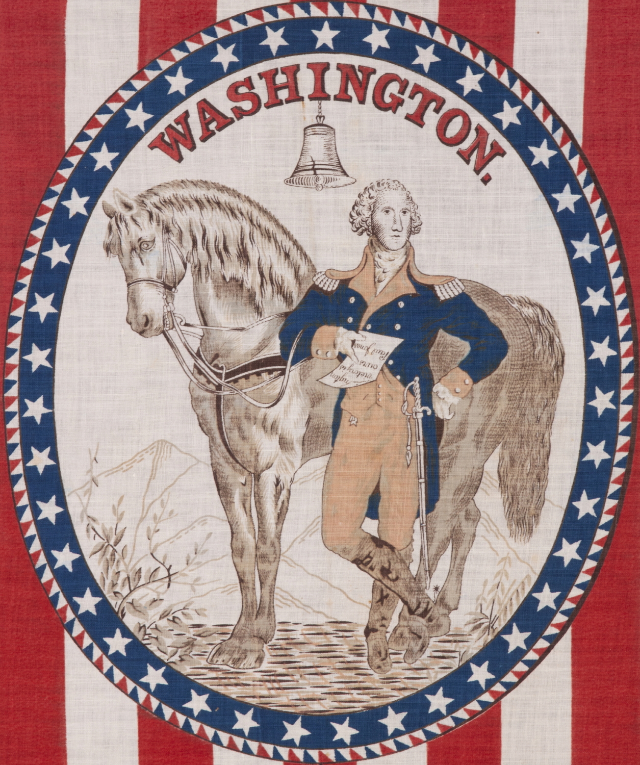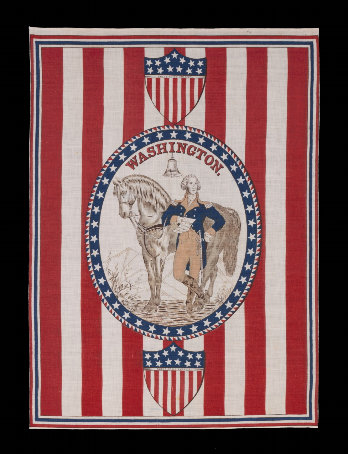 | ANTIQUE AMERICAN PARADE FLAG / BANNER WITH A STANDING PORTRAIT OF GEORGE WASHINGTON & HIS HORSE, “BLUESKIN” SET WITHIN AN OVAL WINDOW, ON A GROUND OF RED & WHITE STRIPES, MADE FOR THE 1876 CENTENNIAL OF AMERICAN INDEPENDENCE |