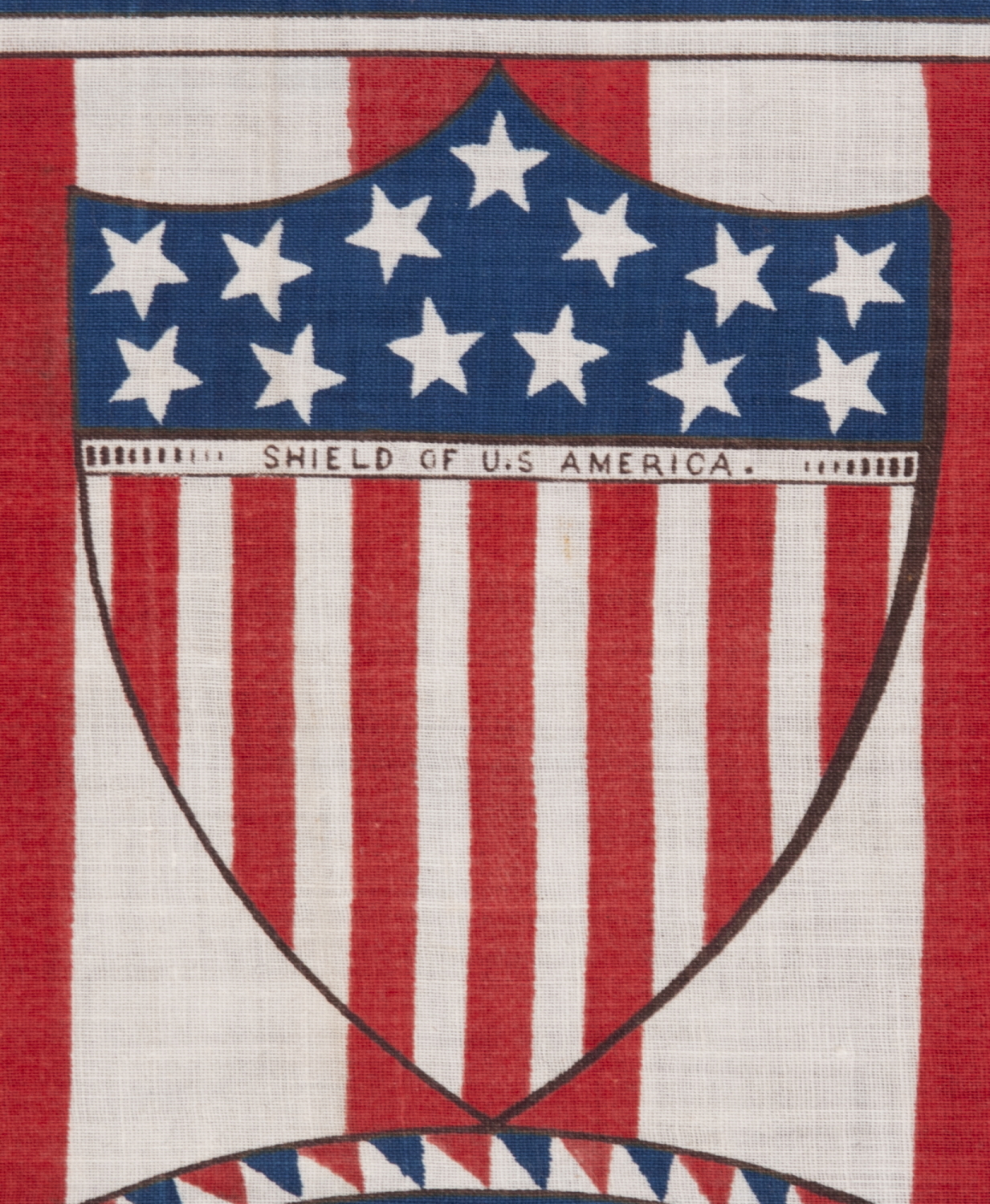 | Patriotic American parade flag / banner, printed on plain weave cotton, made to celebrate the 100th anniversary of American independence in 1876. In spite of its vertical orientation, this striking example was intended to be tacked to a wooden staff, along what would appear to be its top edge, to be waved as if it were a traditional, horizonal, Stars & Stripes format parade flag. With strong colors and endearing folk quality, the image of Washington is a take on the view painted by the artist John Trumbull, that depicted his likeness before the battle of Trenton. The engraver of this rendering (unknown) illustrates commanding general with a letter of correspondence in his hand that reads: Washington Victory is Ours Paul Jones The inclusion of Washington’s horse is of notable interest. This is “Blueskin,” one of two that most often accompanied him throughout the war, the other being “Nelson”. Above the general hangs the cracked Liberty Bell. All of this is framed within an oval window, framed by 39 white stars on a blue band, inside a red & blue sawtooth border. Above and below the center medallion are federal shields with 13 stars, on the waists of which are the words: “Shield of U.S. America”. Though there were 37 states coming into the year 1876, and an official count of 37 stars, and though Colorado joined the Union as the 38th state on August 1st of that year, some flag-makers thought that the Dakota Territory was likewise soon-to-be added (as a single state), adding a 39th star, in advance of its arrival, in hopeful anticipation. While the Dakotas would not join for another 13 years, numerous flags and patriotic objects were produced for our nation’s important birthday, with various representations of 39 stars. The banner is certainly one of the most beautiful and graphic of all printed centennial textiles of this nature. Sometimes examples of it can be encountered in centennial quilts, pieced alongside other banners, kerchiefs, parade flags, and/or other centennial fabrics. Because it appears in quilts accompanied by textiles known to have been made and used at the 1876 Centennial International Exhibition in Philadelphia, specifically—our nation’s first World’s Fair, that served as the nucleus of the national celebration—this type of flag was undoubtedly displayed and distributed at that event. Though the name of the maker remains unknown, the same design was employed as a template for flags used in the 1880 presidential election, created for both the successful campaign of Republican Candidate James Garfield, and that of his Democrat opponent, Winfield Scott Hancock. In each case, bust portraits of the men were substituted for the image of Washington and his horse. An example of the Washington parade flag / banner resides in the collection of the Smithsonian Institution’s Division of Political History, documented as item 376 in “Threads of History, Americana Recorded on Cloth, 1775 - the Present” by Herbert Ridgeway Collins (1979, Smithsonian Press), p. 188. Collins formerly served as the Smithsonian’s curator of Political History. His book is considered the Bible of political flags, kerchiefs, and related textiles. Mounting: The flag was mounted and framed within our own conservation department, which is led by expert staff. We take great care in the mounting and preservation of flags and have framed thousands of examples. The exceptional, gilded molding has an early American profile. To this a black-painted, shadowbox molding, with a bowed profile and a textured surface, was added as a cap. The background is 100% cotton twill, black in color, which has been washed and treated for colorfastness. The glazing is U.V. protective acrylic (Plexiglas). Condition: Absolutely exceptional among known examples. There are tack holes along the hoist (top) edge, where the flag was once affixed to its original wooden staff, and there is extremely minor foxing and staining, almost not worth mention. |