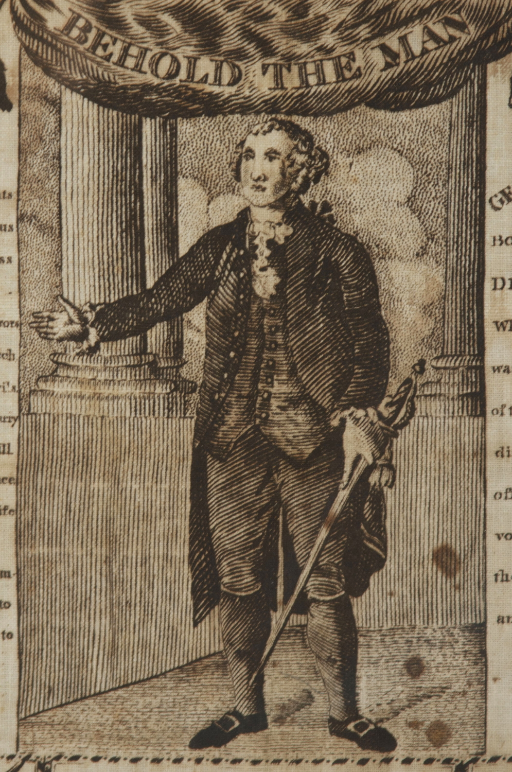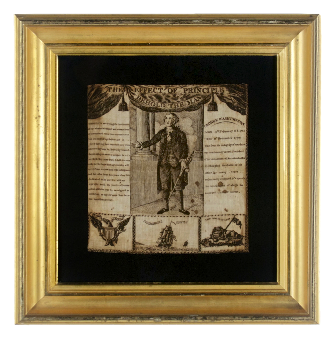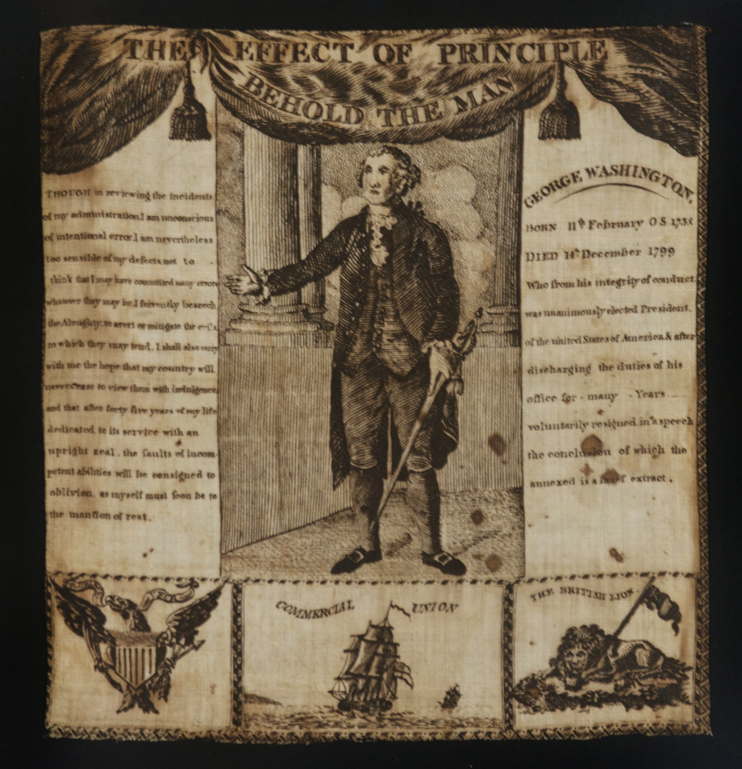Printed in sepia ink on coarse, white linen, this patriotic kerchief shows a standing portrait of George Washington, above which is a swag valance and the words “The Effect of Principle, Behold the Man”. The portrait is based on a mezzotint after Gilbert Stuart’s very famous painting of Washington in his later years. Stuart painted it in oil on canvas for a wealthy merchant by the name of William Constable, who commissioned the work for Alexander Hamilton.