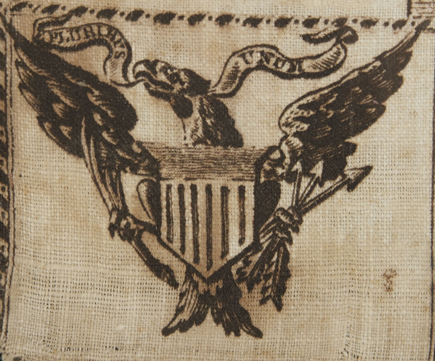 This kerchief and its companion piece are documented in Threads of History, Americana Recorded on Cloth, 1775 - the Present, by Herbert Ridgeway Collins (1979, Smithsonian Press), p. 63, items 38 & 39. The two pieces pictured are in the collection of Cornell University, but the Collins text also cites an uncut pair to be present in the collection of the Western Reserve Historical Society, Cleveland, OH. The name "Germantown Print Works" is printed on the Western Reserve examples. Another example of the textile in question is documented in "Running for President, The Candidates and Their Images, 1789-1896" by Schlesinger, Israel, and Frendt, (1994, Simon & Schuster), p. 15.