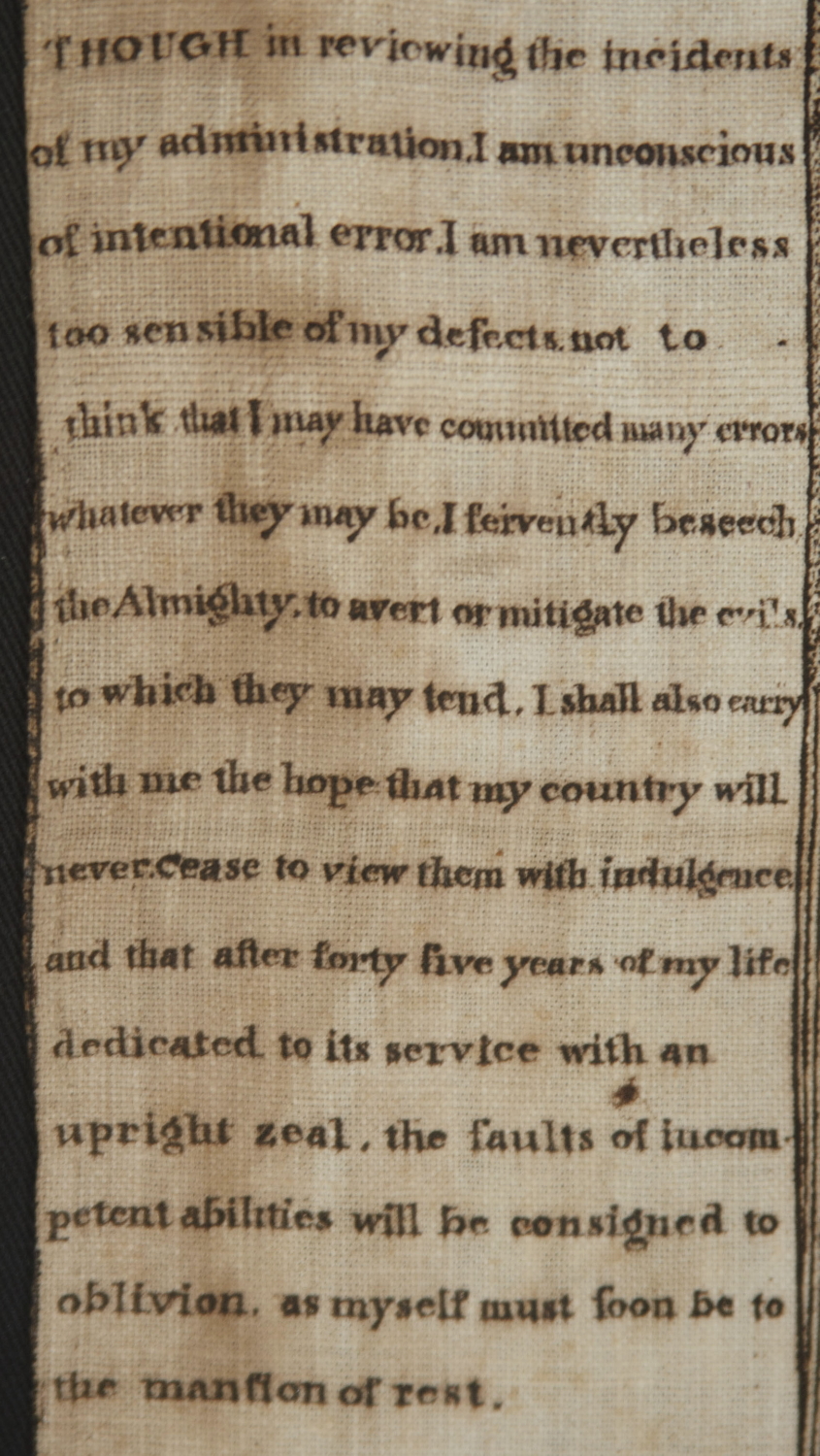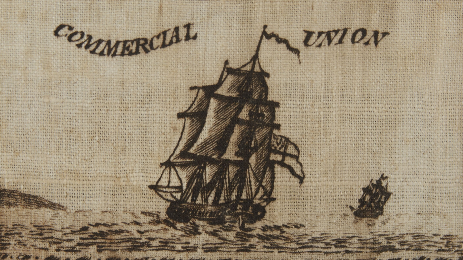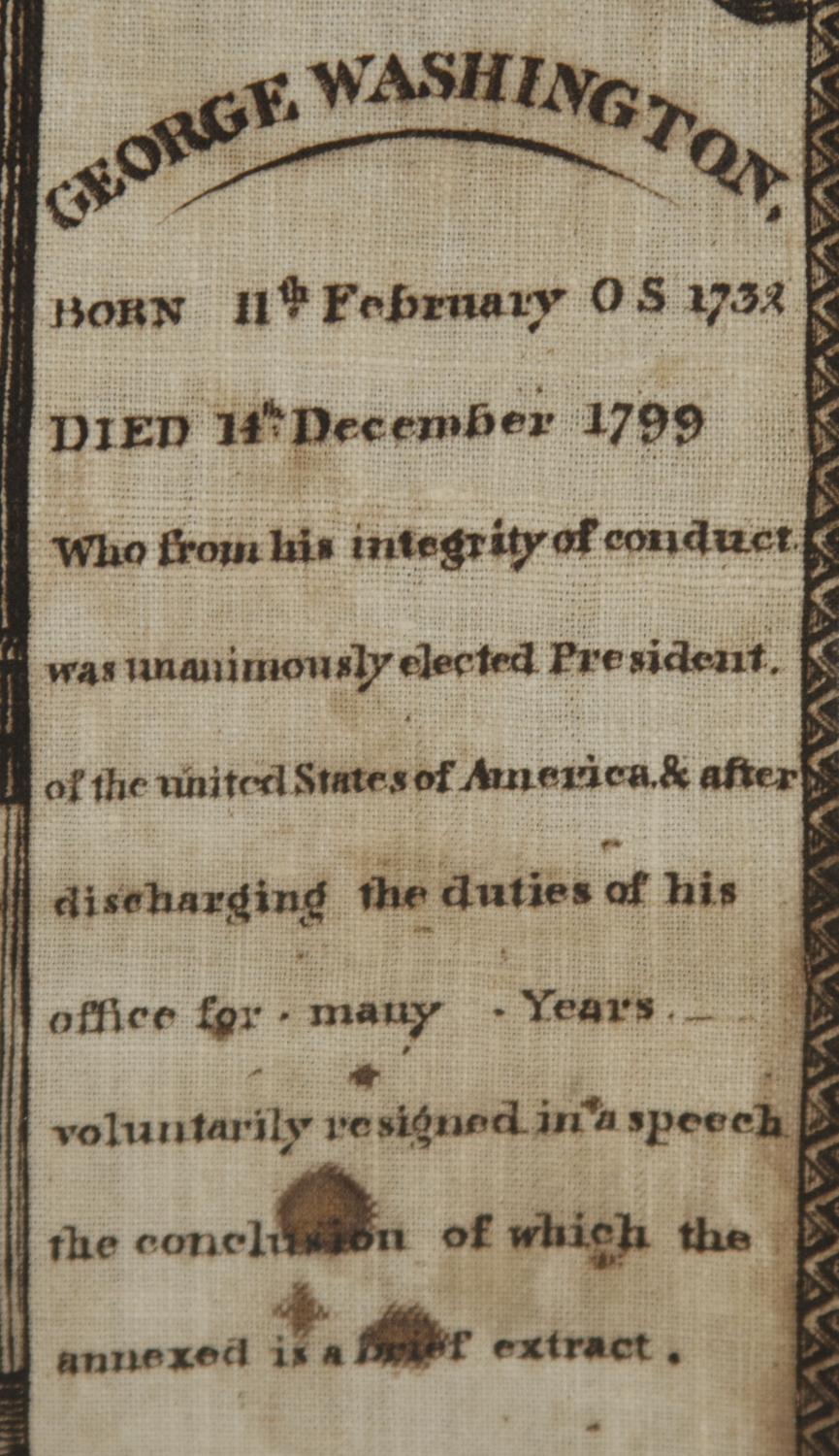 To the left of Washington's image is a portion of his infamous farewell address to his troops at the end of the Revolutionary War. To the right is a short excerpt from his eulogy. Below these are three images. In the center is a square-rigged tall ship with “Commercial Union” above it, flanked by the American eagle on the left and the British lion on the right. It is reasonable to assume that the textile may have been produced in demonstration of the maker's desire, and/or that of others, to advance trade with England. Commercial printers were very influential in early America, as they possessed the means by which to disseminate information.