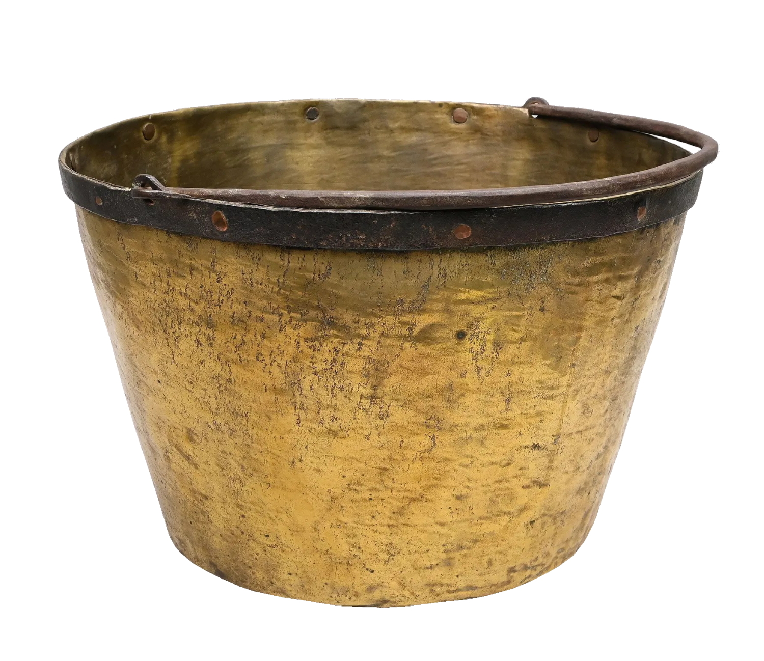 Hand-forged brass kettle with a blacksmith-made, iron rattail swing handle and an iron banded rim, hand-pined with copper rivets. Letters stamped on the interior, below the rim, read: “HBC.” This is the mark of the Hudson’s Bay Company, which traded metal goods such as this with Native Americans from the 18th-the mid-19th century. Made circa 1800-1820, this exceptional example exhibits both great color and beautiful patina.