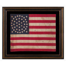 38 STARS IN A "NOTCHED" PATTERN, ON AN ANTIQUE AMERICAN FLAG WITH A DUSTY BLUE CANTON; LEAVES SPACE FOR MORE WESTERN TERRITORIES THAT HAD NOT YET JOINED THE UNION; REFLECTS COLORADO STATEHOOD, 1876-1889