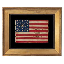ANTIQUE AMERICAN FLAG MADE FOR THE 1860 PRESIDENTIAL CAMPAIGN OF ABRAHAM LINCOLN & HANNIBAL HAMLIN, WITH 31 STARS IN A FANCIFUL STARBURST OR ‘GREAT STAR-IN-A-SQUARE’ MEDALLION; ONE OF THE RAREST AND MOST GRAPHIC OF ALL CONFIGURATIONS THAT HAVE BEEN IDENTIFIED IN 19TH CENTURY EXAMPLES; THE ONLY KNOWN LINCOLN CAMPAIGN FLAG IN THIS STYLE, AND ONE OF JUST 3 PARADE FLAGS OF ANY SORT THAT SHARE THIS SPECTACULAR STAR ARRANGEMENT
