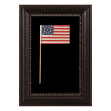 EXTRAORDINARY 34 STAR ANTIQUE AMERICAN FLAG WITH AN ACCORDION OR HOURGLASS MEDALLION CONFIGURATION THAT SURROUNDS A PENTAGON OF STARS IN THE CENTER; MADE OF FINE SILK AND ENTIRELY HAND-SEWN; MADE DURING THE OPENING YEARS OF THE CIVIL WAR (1861-63), IN A TINY SIZE AMONG ITS COUNTERPARTS OF THE PERIOD; REFLECTS THE ADDITION OF KANSAS AS THE 34TH STATE
