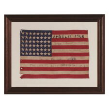 37 STARS IN A VERY RARE DIAMOND CONFIGURATION, WITH PILLARS OF STARS ON EITHER SIDE, NEARLY IDENTICAL TO A LARGER EXAMPLE PRESENTED BY CIVIL WAR GENERAL BENJAMIN BUTLER TO PRESIDENT LINCOLN AS THE FIRST AMERICAN FLAG EVER CONSTRUCTED OF ENTIRELY AMERICAN-MADE MATERIALS, JUST 3 DAYS PRIOR TO HIS 1865 ASSASSINATION; THIS STAR COUNT ANTICIPATORY TO THE FUTURE ADDITION OF NEBRASKA