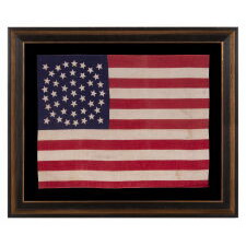 Web ID: 31j-839 37 STARS IN A VERY RARE DIAMOND CONFIGURATION, WITH PILLARS OF STARS ON EITHER SIDE, NEARLY IDENTICAL TO A LARGER EXAMPLE PRESENTED BY CIVIL WAR GENERAL BENJAMIN BUTLER TO PRESIDENT LINCOLN AS THE FIRST AMERICAN FLAG EVER CONSTRUCTED OF ENTIRELY AMERICAN-MADE MATERIALS, JUST 3 DAYS PRIOR TO HIS 1865 ASSASSINATION; THIS STAR COUNT ANTICIPATORY TO THE FUTURE ADDITION OF NEBRASKA