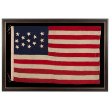 13 STAR ANTIQUE AMERICAN FLAG WITH A MEDALLION CONFIGURATION OF HAND-SEWN STARS AND A BEAUTIFUL, ELONGATED PROFILE, MADE IN THE ERA OF THE 1876 CENTENNIAL OF AMERICAN INDEPENDENCE, IN AN UNCOMMONLY SMALL SIZE AMONG ITS COUNTERPARTS OF THE PERIOD WITH SEWN CONSTRUCTION