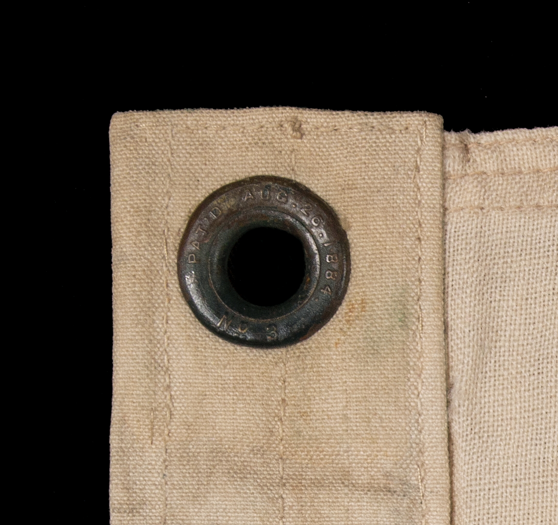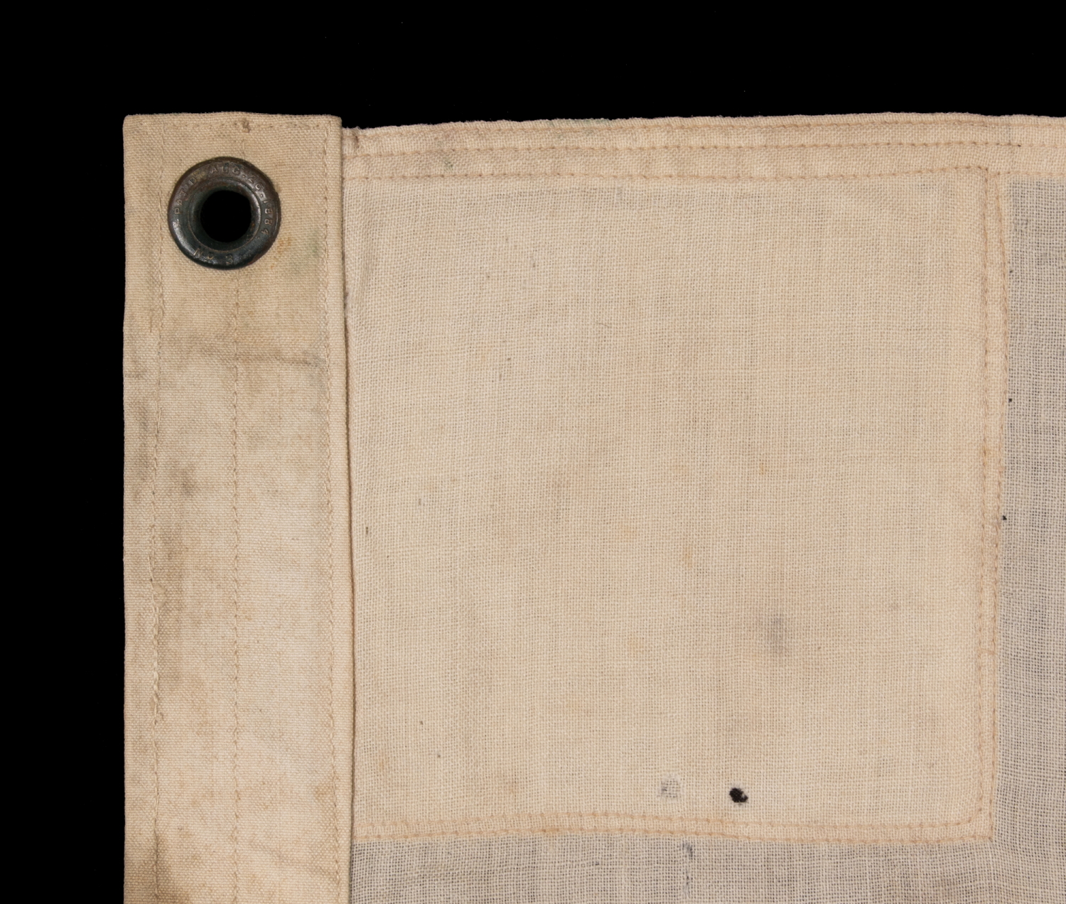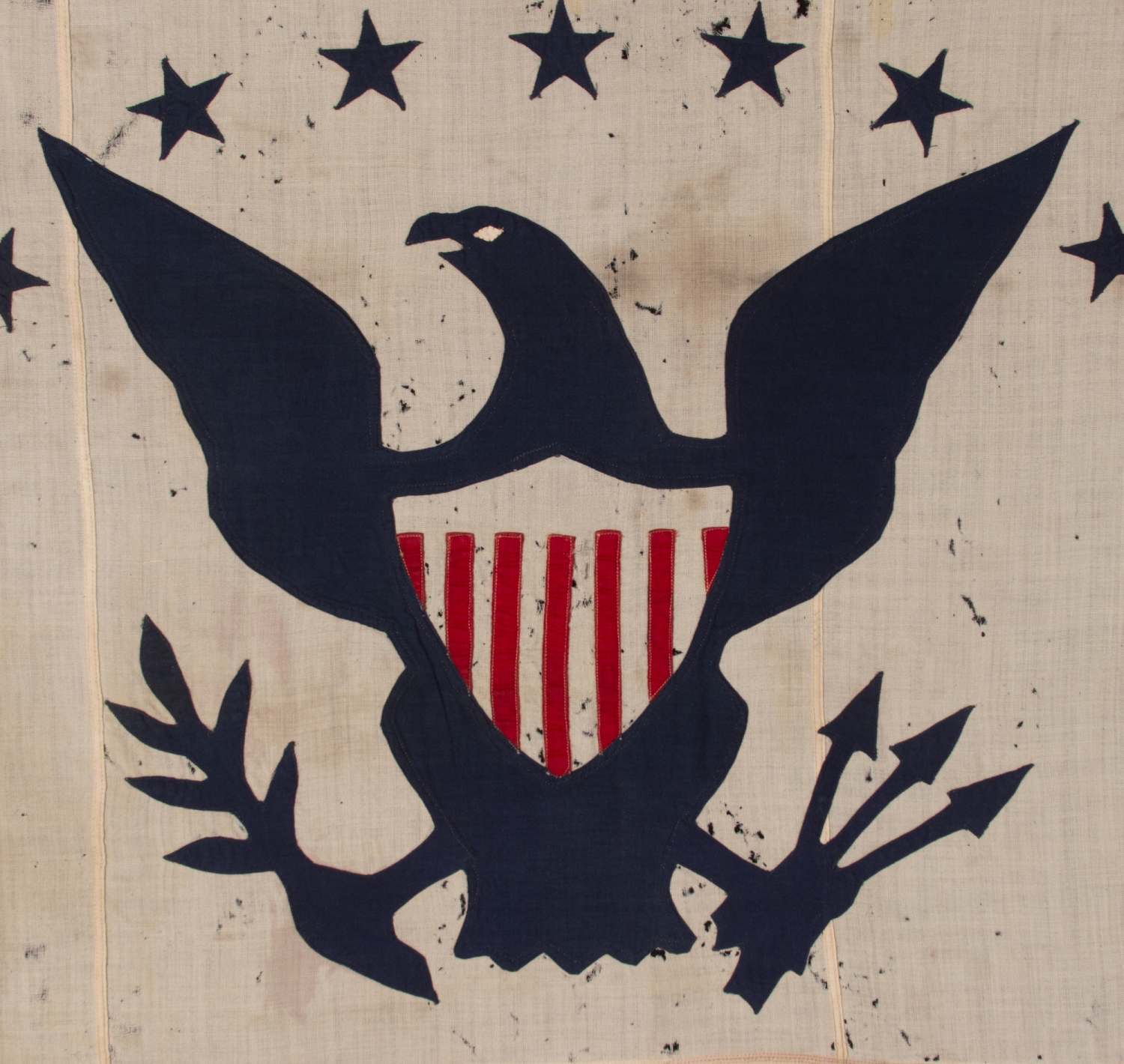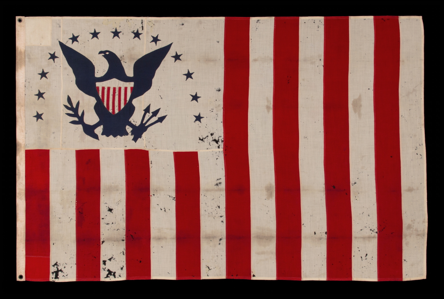 | The Revenue Marine was founded by U.S. Treasury Secretary Alexander Hamilton, through an act of the United States Congress passed August 4th, 1790. Tasked with the protection of merchant ships in and around major ports, its duty was to ensure the safe transport of goods, to deter looting and piracy, and to oversee that proper tariffs and customs fees were collected. Because there was as of yet no income tax, this was our nation’s most significant revenue stream and extremely important to the U.S. Treasury. Protection on the open waters was not only financially critical, but fundamental to the safety of the new nation. Most Americans don’t realize that for a period of time following the Revolutionary War, the navy was disbanded and there were no ships. Vast debt, incurred to fund the Revolution, was partly repaid through the sale of all remaining warships to France. In the formation of the Revenue Marine, Hamilton ordered 10 ships, that were distributed across various ports. Washington suggested to Hamilton that each captain selected for service oversee the building of his own ship. While the U.S. Treasury held the overall umbrella for this military-like force, each ship was directly responsible to the customs collector in whichever port it sailed from. Captains had wide-ranging authority to do what they saw fit to keep order, and could board and search any vessel whether docked or at sea. From 1790 until the U.S. Navy reformed in 1798, Revenue Cutters were the only armed American ships in government service. The Revenue Marine thereafter fought alongside the U.S. Navy and have since participated in every major U.S. seafaring conflict. Reorganized a couple of times during the 19th century, the scope of its mission began to grow. First by default, then by a change in general orders, one of its functions became the rescue of ships in distress. In 1894, the name was formally changed to the Revenue Cutter Service (RCS). This would become the most widely coined title by historians and collectors of related artifacts. The basic format of the flag is question here was actually adopted by an act of Congress in 1799, for use by the Customs office on ships of the Revenue Marine. Designed by Oliver Wolcott, there were to be 16 stripes, and probably as many stars. Wolcott, who replaced Alexander Hamilton as Secretary of the Treasury in 1795, selected the count of 16 in accordance with the logic employed in the Flag Act of the same year, passed by Congress, that added 2 stripes and 2 stars to the previous counts of 13 stars and 13 stripes, in order to reflect the 1791 addition of Vermont, and the 1792 addition of Kentucky, as the 14th and 15th states. Since Tennessee had entered the Union on June 1st, 1796, the 1799 customs flag legislation occurred at a time when there were a total of 16 states. Because the original records in regard to this matter were destroyed when the British burned Washington, in 1814, specifics regarding the star count on Revenue Marine flags remain unknown. One early illustration depicts a flag with 15 stars and 16 stripes, curiously excluding Tennessee in the star count, yet including it in the stripes. Likewise curious is the fact that while 16 stripes were specified on the flag of the Revenue Marine, 16 was never an official star count for the Stars & Stripes. It wasn’t until 1818, when 4 more states, in addition to Tennessee, had joined the Union, that congress decided to once again change the national flag, updating the number of stars from 15 to 20. At this time, the stripe count was permanently returned to 13. The fear, of course, was that they would grow to become pinstripes, if they continued to mirror the number of states. Among the tiny number of surviving examples that date to the 19th century (there are no 1799 examples), all have 13 stars and 16 stripes, except one, that displays 13 stars and 13 stripes. Inconsistency was actually more of a rule than an exception in early America, when an enormous amount of artist’s liberty was taken in the replication of flags, state and federal seals, and all manner of the related components thereof. Made sometime between roughly 1885 – 1895, this particular flag of the Revenue Cutter Service flag displays 13 stars and 16 stripes. Note how the eagle, tall and narrow, with wings raised (some display them down), bears an ample degree of folk quality, that impacts its overall presentation. Since eagles are both very desirable, and rare, on early American flags of all kinds, and because flags of the RCS are so graphically different, and visually arresting, rare, 19th century examples, such as this one, make a great addition to any collection. The canton and stripes of the flag are made of wool bunting that has been pieced and hemmed by treadle stitching. The square patches in the upper and lower corners at the hoist end are called gussets. These were included where the flag received the most stress when flown and are original to its construction. The stars are made of cotton and are double-appliquéd (applied to both sides), also with a lineal, treadle stitch, as are the 7 red, vertical stripes (called pales), that, together with the white wool bunting onto which they were sewn, form a federal shield a count of a total of 13. The blue cotton fabric was single-appliquéd to the white field, to form the eagle. This means that a cutout was made on the reverse, and the blue fabric was under-hemmed, with treadle stitching, in this instance, so that its profile is viewable both sides. The diamond-shaped eye of the eagle, made of white satin or polished cotton, is hand-sewn and double-appliquéd. There is a heavy, sailcloth canvas binding along the hoist, with 2 brass grommets, each of which is stamped: “Pat’d Aug.26.1884,” followed by “No 3.” The presence of these marks can be seen on the grommets of flags produced by the U.S. Navy between the 1880’s and around 1915. The navy generally made its own flags at severa