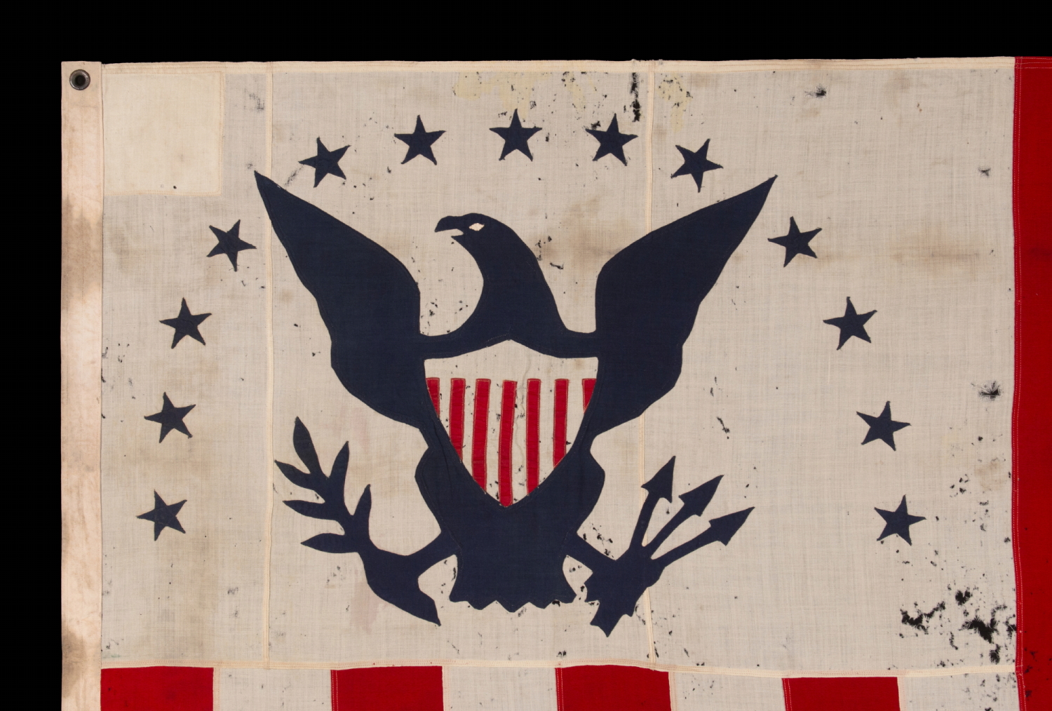 | LATE 19th CENTURY FLAG OF THE REVENUE MARINE (a.k.a., REVENUE CUTTER SERVICE), WITH A BLUE EAGLE AMID AN ARCH OF 13 BLUE STARS, ON A WHITE CANTON, AND 16 RED & WHITE, VERTICAL STRIPES, MADE circa 1885-1895 |