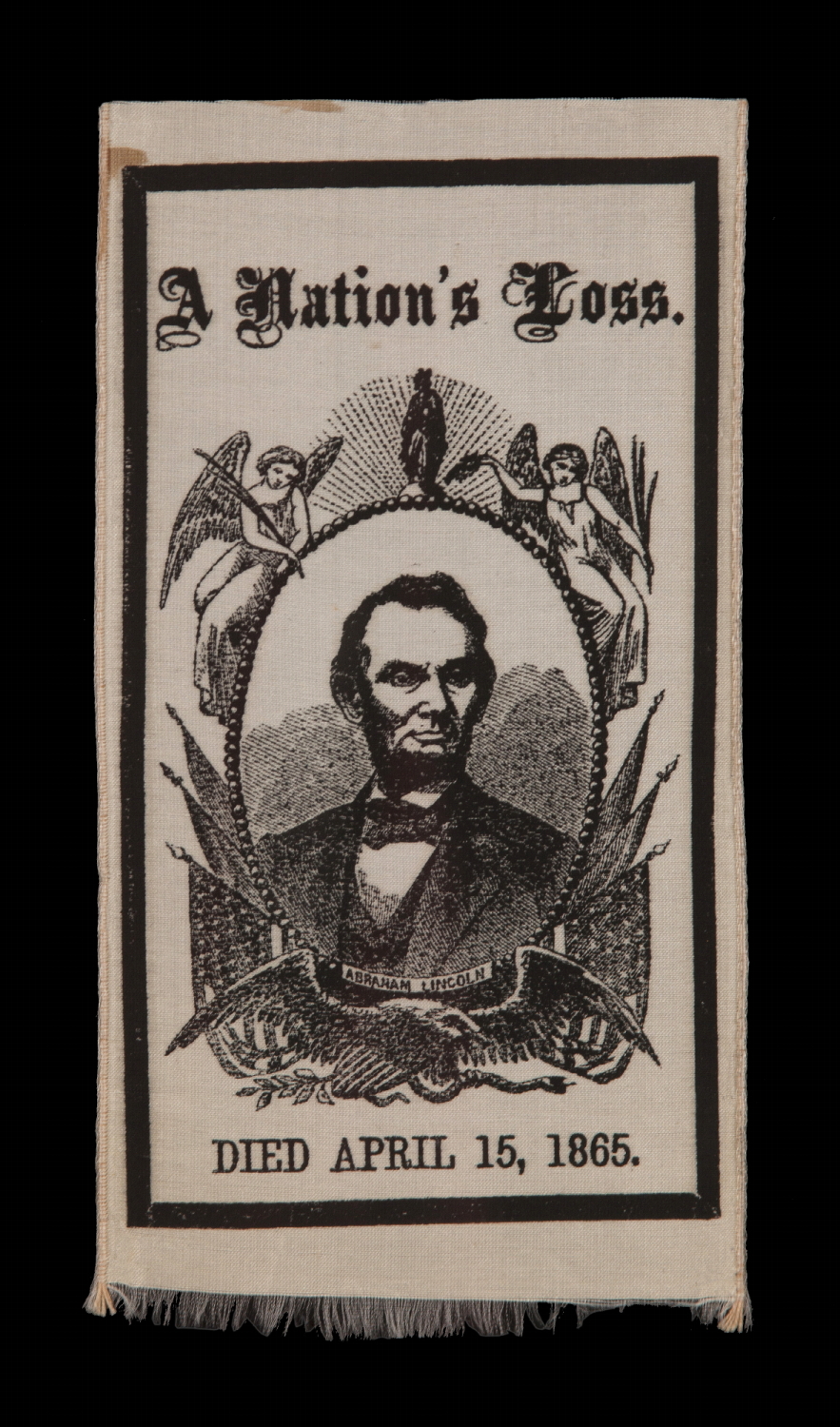 | "A NATION'S LOSS": SILK, 1865, ABRAHAM LINCOLN MOURNING RIBBON IN AN ESPECIALLY ATTRACTIVE PORTRAIT DESIGN |