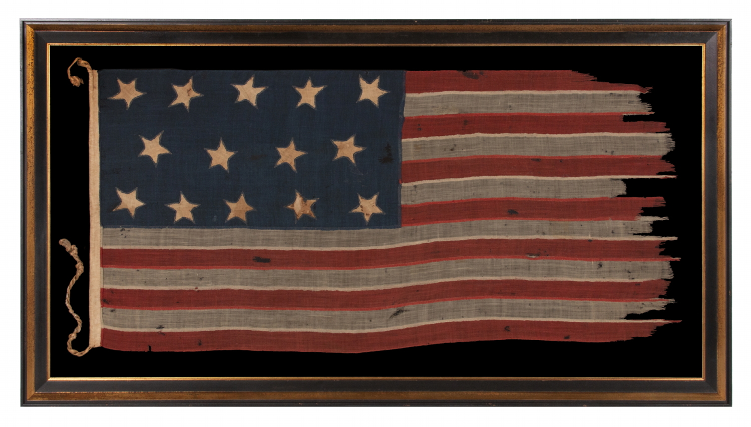 Due to the lack of 14 star flags in any early period, as well as to the pre-Civil war date, the likelihood of an interesting, abolitionist intent, and U.S. Navy function, this is a fantastic example of the period. When these traits are augmented by the flag’s spectacular graphic features, with whimsical stars pointing in all directions, and then endearing loss from obvious extended use, the result is a flag that is worthy of any great collection.