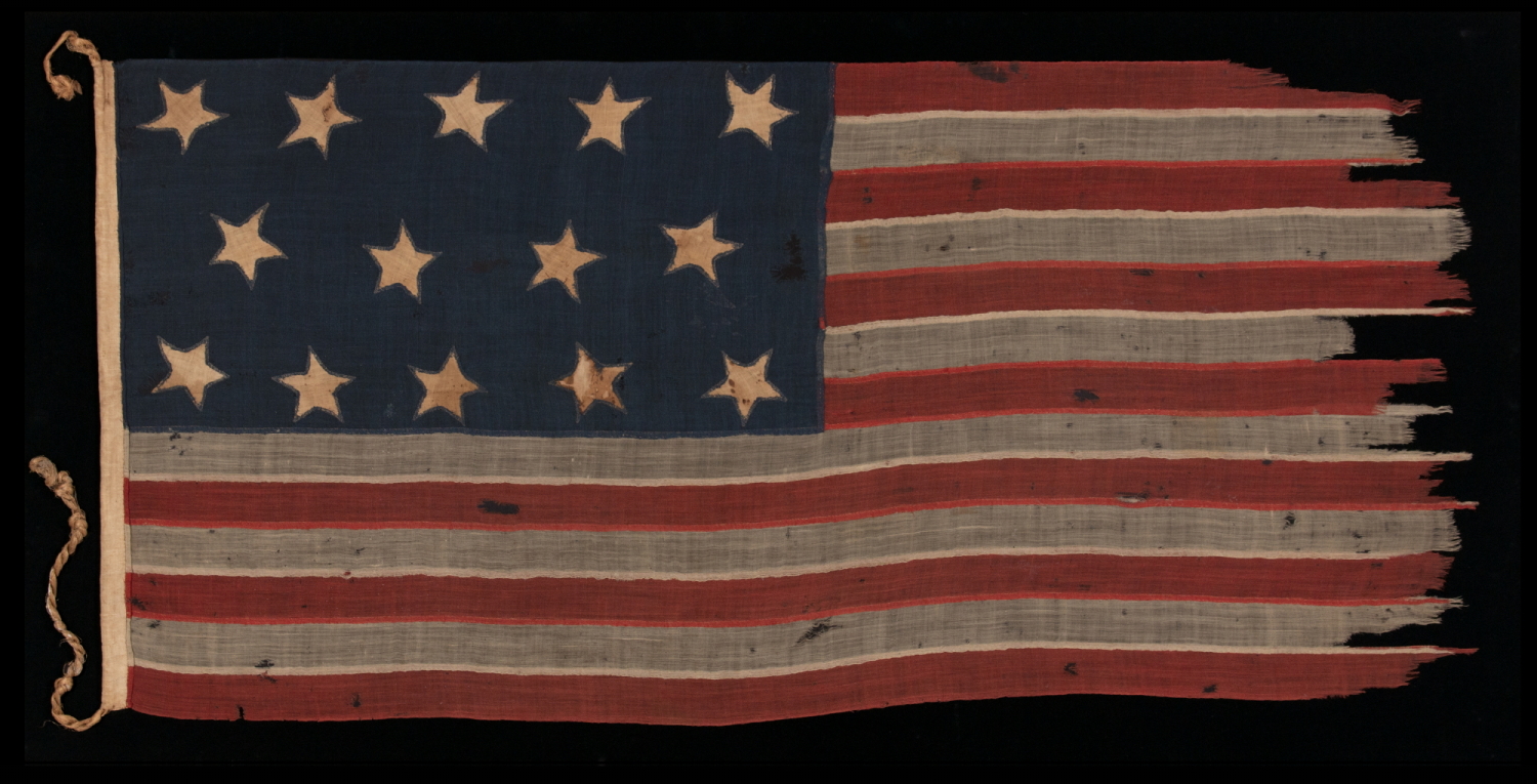 EXTREMELY RARE 14-STAR, 13-STRIPE FLAG, LIKELY MADE DURING THE ANTEBELLUM WITH AN ABOLITIONIST MESSAGE, ENTIRELY HAND-SEWN AND WITH ENDEARING WEAR FROM OBVIOUS USE, POSSIBLY OF U.S. NAVY ORIGIN, circa 1846-1848; EXHIBITED AT THE MUSEUM OF THE AMERICAN REVOLUTION FROM JUNE – SEPTEMBER, 2021 |